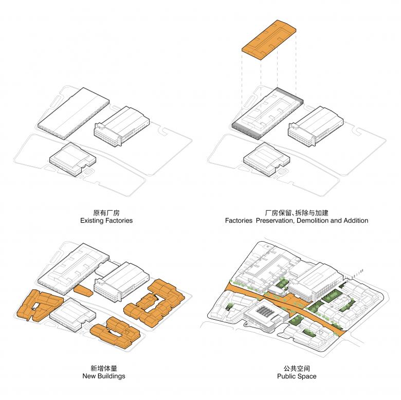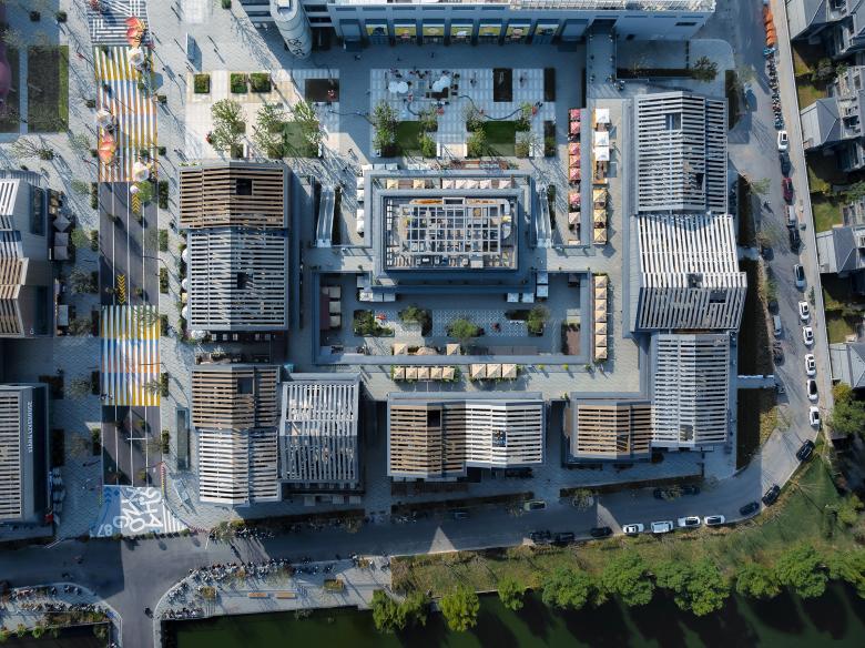 3 additional villages were constructed, weaving and reinforcing the urban fabric. The design draws inspiration from old factories and divides the large volume into an organic composition of smaller “factory-like” structures. It avoids a singular and monotonous sloped roof, instead employing a method of offsetting to create variations in height. This approach preserves the traditional architectural language while giving the facades a more modern and dynamic appearance.