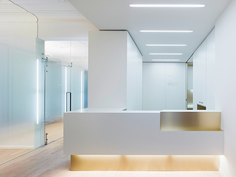 Die Praxis bezieht die Belle Étage eines Jugendstilwohnhauses, die beeindruckende Raumhöhen und prächtige Stuckornamentik kennzeichnen. Bei der Innenarchitektur war es einerseits Aufgabe, den historischen Baubestand mit Respekt und Sorgfalt zu behandeln und trotzdem den Anforderungen einer modernen Praxis gerecht zu werden. Andererseits sollte eine innenarchitektonische Übersetzung des Begriffs »weissraum« gefunden werden. Beim Betreten der Praxis wird »weissraum« zunächst auch als weiße Architektur sichtbar. Alle Wände und Decken erstrahlen in Weiß. Auch die neuen Einbauten sind durchgehend in der namengebenden Farbe gehalten und werden lediglich durch wenige goldene Flächen akzentuiert, die Wertigkeit assoziieren. Diese Einbauten ziehen sich als durchgehendes Band durch die gesamte Praxis, vom Treppenabgang entlang des Flurs bis in den Wartebereich hinein. Als weiteres raumübergreifendes Thema fungiert der Boden, der als durchgehendes Eichenparkett ausgeführt ist. Dieses ist ebenfalls geweißt und erhält dadurch einen leichten, schwebenden Charakter. Gleichzeitig gibt der Boden den Räumen eine besondere Natürlichkeit, die die häufig mit der Farbe Weiß assoziierten Eigenschaften Künstlichkeit und Sterilität gar nicht erst aufkommen lassen.