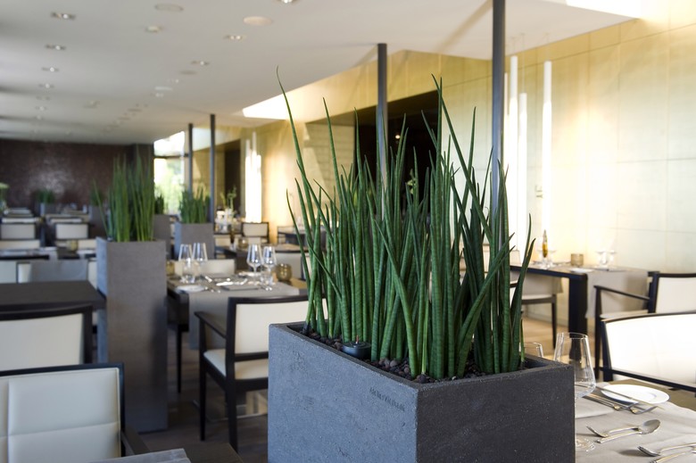 Überall wurden natürliche, aber äusserst wertige und natürliche Materialien verwendet. Etwa in der lebenden Pflanzenwand, die den Gast beim Eintritt in die Lobby mit hellgrünem Ficus pumila begrüsst. Im Restaurant- und Barbereich bestechen die stolzen, aufrecht wachsenden Sansevieria cylindrica in den hochwertigen, handgefertigten Tongefässen der belgischen Manufaktur Atelier Vierkant.