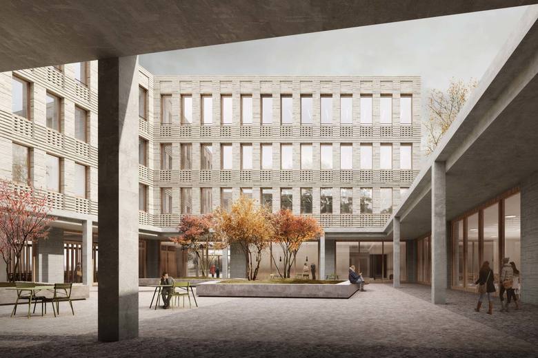 Die Fassade der Neubauten ist geprägt vom Zusammenspiel eines Betonsockels mit darüber aufgehender, fein ausgearbeitete Ziegelfassade, um dem Ensemble ein homogenes, dauerhaftes, ganzheitliches Erscheinungsbild zu geben. Das Ziegelmauerwerk der Obergeschosse erhält leichte horizontale Reliefs mit nach oben abnehmender Tiefe, um die Baukörper zu gliedern und durch seine feine Detailausprägung die Bedeutung des Neubaus als öffentliches und kirchliches Gebäude in der Stadt zu unterstreichen.