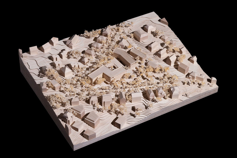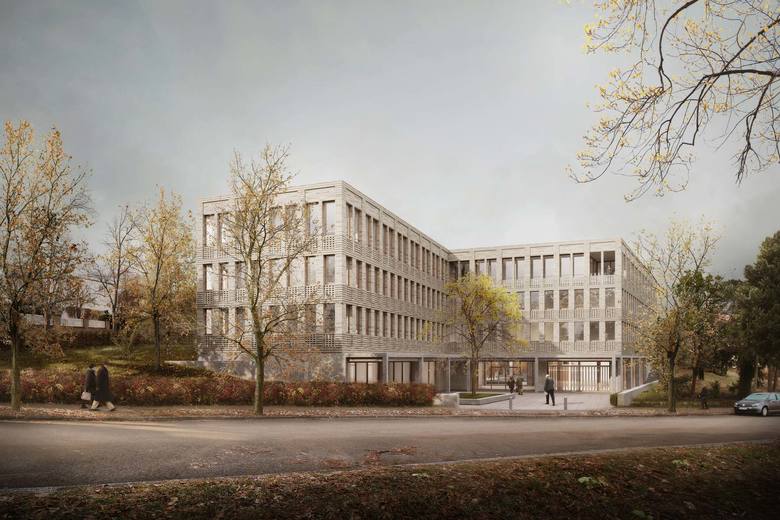 Das Projekt für den Ev. Oberkirchenrat verortet am bestehenden Standort an der Gänsheidestraße nach Abbruch der Bestandsgebäude ein Ensemble aus zeitgemäßen, zukunftsorientierten Verwaltungsneubauten, deren durchgängige Sprache und Identität im bewussten Dialog mit der umgebenden, parkartigen Landschaft stehen. Die Gebäudestruktur versteht sich dabei als ein in die Topografie eingebettetes, verbindendes Sockelgeschoss mit drei darüber aufgehenden Einzelgebäuden. Die Form der Gebäudefiguren auf dem gemeinsamen Sockel leitet sich sowohl aus dem engen Korsett der Baugrenzen und als auch aus der Idee ab, den oberirdischen Baukörpern über die bewusste Einführung von Winkeln und Knicken eine dreidimensionale Qualität zu verleihen und differenzierte Außenräume sowie Frischluftschneisen zwischen den Gebäudeteilen zu schaffen.
