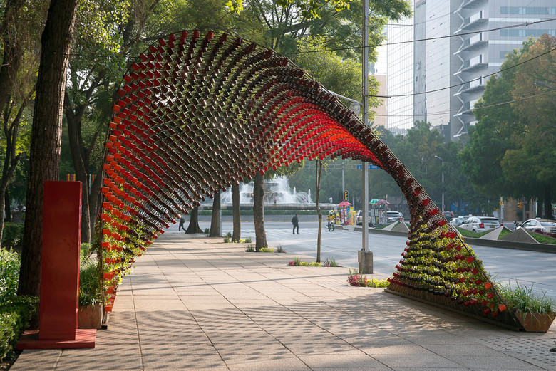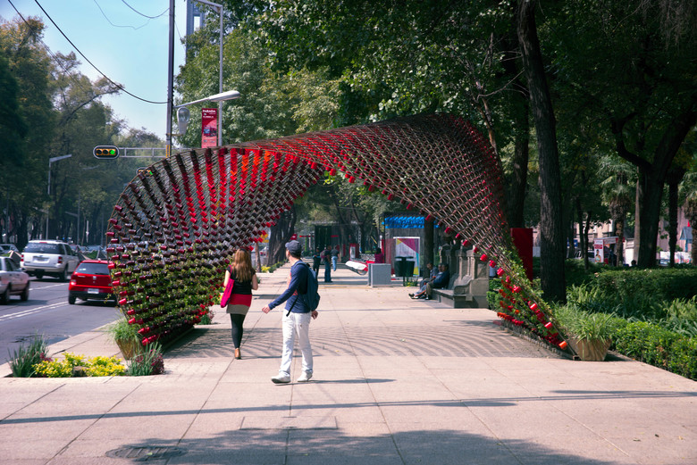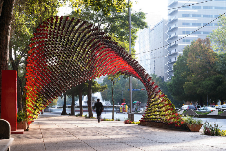 Rojkind Arquitectos conceived its installation as a portal activated by city dwellers and the everyday stimuli of Mexico City. It combines a common every-day-life object, a mug, with a basic common architectural construction material, steel rebar. The rebar, configured as a mesh, is used as the primar y structure for the mugs, which are then mechanically attached to it. The mesh is woven from 41 main arches, ranging in length from 10 to 12 meters, intercepted by two additional layers of 56 diagonals each, creating 1497 nodes where the mugs reside.