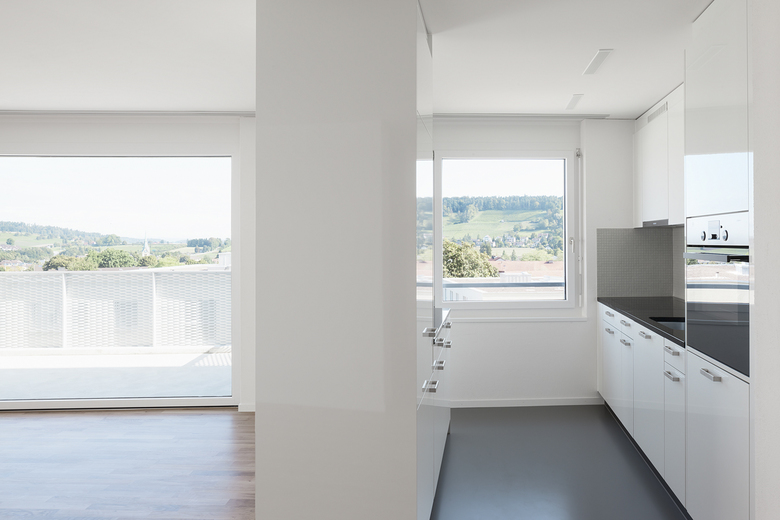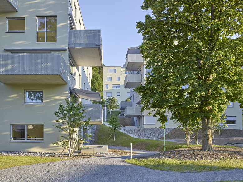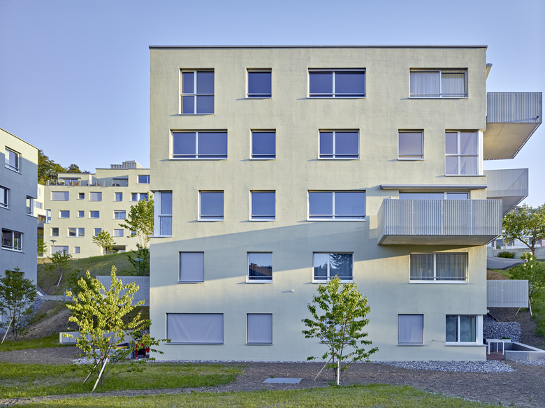 Im Stadtteil Winterthur-Wülflingen entsteht die Wohnüberbauung Hohfurristrasse/Eichenweg. Am Rand einer heterogenen Wohnbebauung liegend, schliesst sich das Grundstück sowohl an die Stadt als auch an das sich im Osten und Süden erstreckende Natur- und Erholungsgebiet an. Das nordwärts gerichtete Hanggrundstück bedingt, dass Aussicht und optimale Orientierung zur Sonne entgegen gesetzt sind. Das Grundstück wird vom Eichenweg in zwei ungleiche Hälften geteilt. Zwei ungerichtete, grobe Volumen besetzen den kleinen Geländespickel. Die vier differenzierten, aber typologisch verwandten Häuser auf der nördlichen Parzelle bilden eine formale Einheit mit der ersten Etappe. Die prägnanten, allseitig orientierten Baukörper vermitteln zwischen der unteren Zeilenbebauung und der oberen Einfamilienhaussiedlung. Die einfühlsame Setzung in das steil abfallende Terrain spannt fliessende Aussenräume auf und ermöglicht die Inszenierung der Umgebung, welche die Gebäude als mit Einzelbäumen bestandene Wiese umspült. Die örtliche Verankerung der Häuser wird durch die Anbindung an zwei verschiedene Erschliessungsstrassen gestärkt. Das zentrische, windmühlenartige Grundrisskonzept mit zueinander versetzten Balkonen ermöglicht jeder Wohnung sowohl Aussicht als auch Besonnung. Der Zweispänner der kleineren, steileren Parzelle wird vom Eichenweg her erschlossen, der leicht versetzte Dreispänner über einen Steg von der Hohfurristrasse aus. Die dem Hang folgenden Splitlevel-Wohnungen erzeugen offene Raumflüsse und grenzen private Zimmerzonen von den Wohn-Essbereichen ab. Die Dreispänner der grossen, nördlichen Parzelle werden vom Eichenweg her erschlossen. Die Geschosswohnungen sind aufgrund der flacheren Hanglage einfacher geschnitten, aber ebenfalls zu zwei oder gar drei Himmelsrichtungen orientiert. Unterschiedlich gesetzte Fenster und versetzt angefügte Balkone individualisieren die dahinter liegenden Wohnungen weiter. Nach aussen erscheint die gesamte Überbauung als einheitliches Ensemble. Die verfeinert ausgearbeitete Fassadengestaltung widerspiegelt die Reichhaltigkeit des Wohnungsangebotes und bildet die räumliche Komplexität der Grundrisse nach aussen ab. Die Materialien fangen das einstrahlende Licht ein und versuchen es zu reflektieren und zu potenzieren. Der Putz auf den ost- und westwärts gerichteten Fassaden ist mit Interferenzfarben akzentuiert, um den sich ändernden Lichteffekt zu verstärken. Die Balkonbrüstungen und die eingezogenen Eingangsbereiche in metallischer Oberflächenoptik unterstützen das Erzeugen einer eigenen Stimmung.
