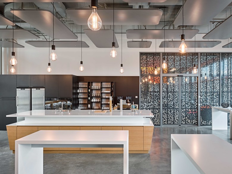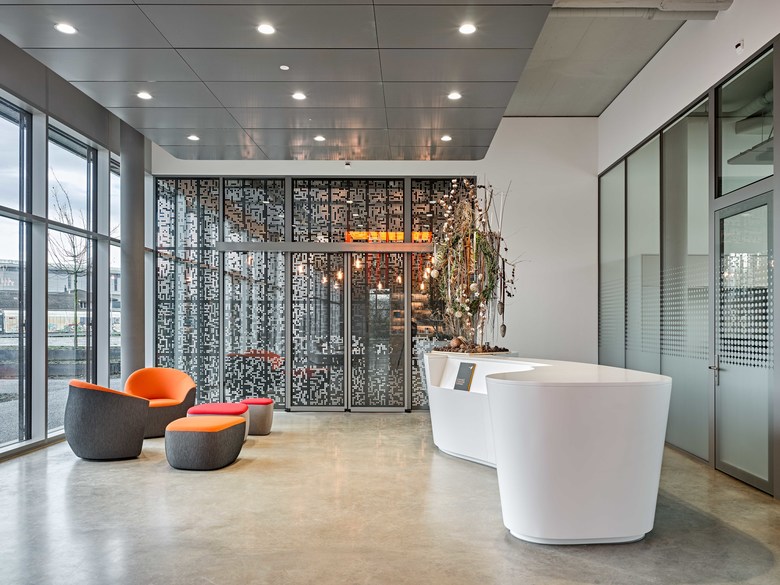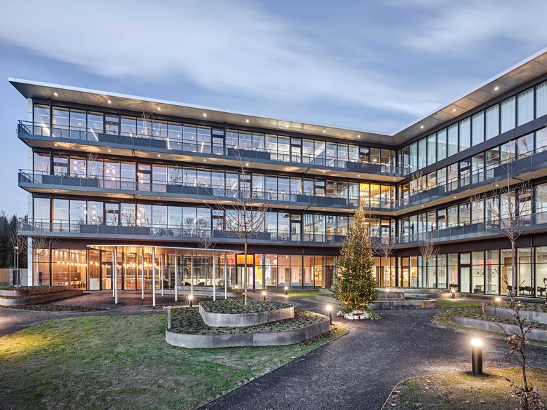 Der differenziert gestaltete Aussenbereich empfängt den Besucher und Mitarbeiter in einer zweigeschossigen Eingangshalle. Nebst dem Empfang befinden sich alle öffentlichen Räume wie Empfang, Restaurant und Schulungs- wie Demoräume. Die Aufenthaltsräume orientieren sich um den begrünten Innenhof, der die Besucher wie die Mitarbeiter zur Erholung oder zum Verweilen einlädt.