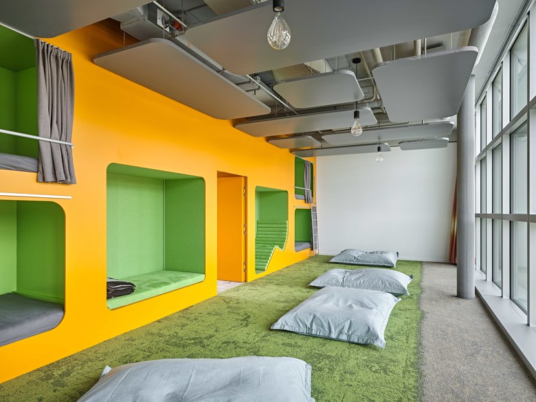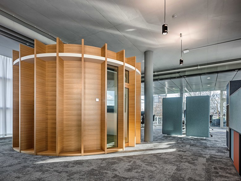 Die vorgelagerten Veranden zum Hof sind Aufenthaltsorte wie auch Schattenspender für die dahinterliegenden Büroräume in den Obergeschossen. Die Büroräume sind gegen Osten und Norden ausgerichtet und minimieren die Sonneneinstrahlung der Bildschirmarbeitsplätze ohne Verlust der natürlichen Belichtung. Bewegliche Trennelemente lassen verschiedene räumliche Lesearten zu. Die Arbeitsplätze können flexibel angeordnet werden. Es sind Bürogruppen bis zu acht Mitarbeiter möglich. Die Kommunikationszonen sind Richtung Innenhof ausgerichtet und bilden mit Sitzungszimmern, Cafe-Bars und Wintergärten übergreifende Räume, die sich auf die Geschosse verteilen.
