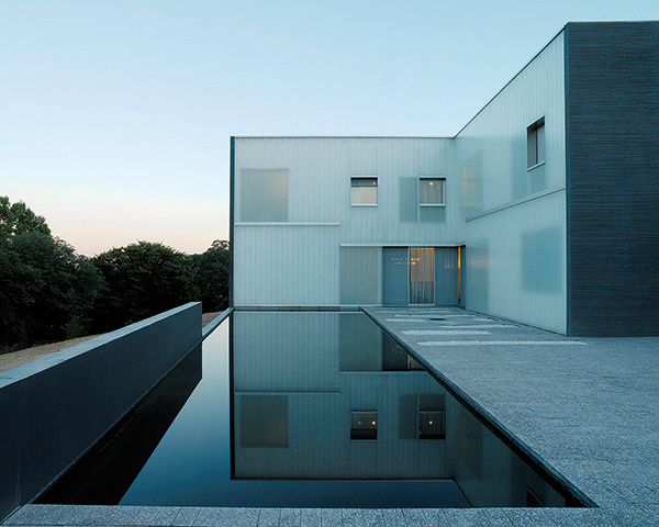 Der gradlinige Grundriss lässt sich bewusst nicht auf die leicht diagonale Form des Baugeländes ein. Während Linienführung und Formen der Architektur klar und einfach sind, verleihen sandgestrahlte, lichtdurchlässige Paneele aus Strukturglas dem Ganzen ein etwas unbestimmtes Erscheinungsbild. Die bei dem Projekt verwendeten Werkstoffe stellen ein wichtiges Merkmal des Entwurfs dar. Der anthrazitfarbige Beton und das milchige Glas sind vom schwarzen Fels und weißen Schnee der Schweizer Alpen inspiriert.
