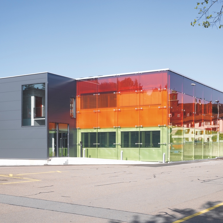 Das Gebäude hat neu eine Doppelhautfassade aus Verbundsicherheitsglas mit gelb, orange und rot eingefärbten Folien im Zwischenraum. Die vor allem im Sonnenlicht stark leuchtenden Farben lassen die Vehrkehrsmanagementzentrale wie eine Verkehrsampel in der sonst eher grauen Gegend entlang der Autobahn aufleuchten.
