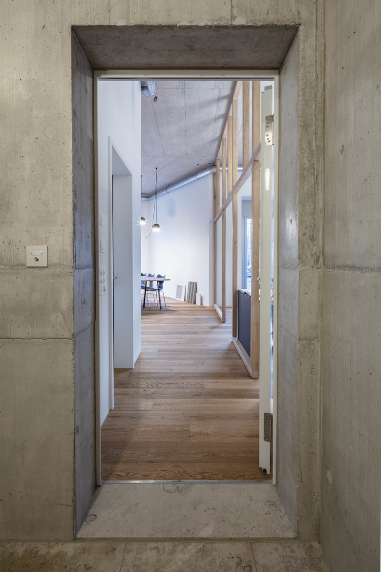 Der Grundriss besteht primär aus drei wesentlichen Teilen, dem grossen Vorplatz um welchen sich unser Büro klammert, den eigentlichen Atelierraum mit leicht abgetrenntem Sitzungszimmer, sowie dem Backoffice in welchem sich die zudienenden Räume befinden. Sämtliches Mobilar bis auf die Stühle wurde selber entworfen und vom Schreiner umgesetzt. Ein cleveres Lichtkonzept lässt die verschiedenen Zonen Meeting, Working und Coffee in einer individuellen Stimmung erscheinen und inszeniert die verwendeten Materialien Holz, Kalkstein und Beton als Hauptprotagonisten.