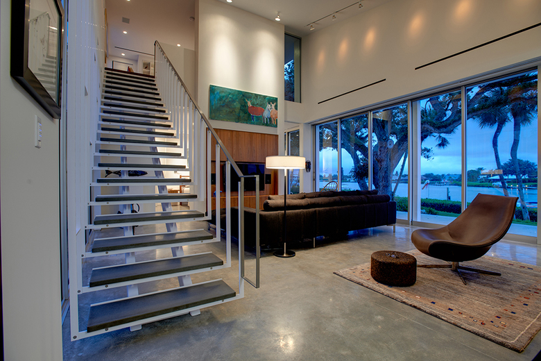 This project is located on the Intracoastal waterway in an area where it is common to bulldoze modest mid-century homes in favor of supersized replacements which dwarf the original scale and character of this quaint neighborhood. In contrast, when below grade plumbing issues necessitated the demolition of the existing house we set out with the goal of reducing the building footprint. The result is a smaller house which respects its context, one which maintains the scale and character of its midcentury neighbors while accommodating new programmatic goals including a loft level, a detached workshop, and an abundance of outdoor space. Improved efficiencies allowed this program to occur within a smaller amount of conditioned space. In order to preserve the many mature live oak trees on site, all new construction was contained within the original building footprint. As with most projects within this hurricane prone environment, stucco clads the primary concrete volume of the house while dark brick and cedar are used as secondary materials cladding accessory volumes and surfaces. A series of 10’ tall hurricane resistant sliding glass panels lends transparency to the primary public spaces while offering uninterrupted views and direct access to the waterway.