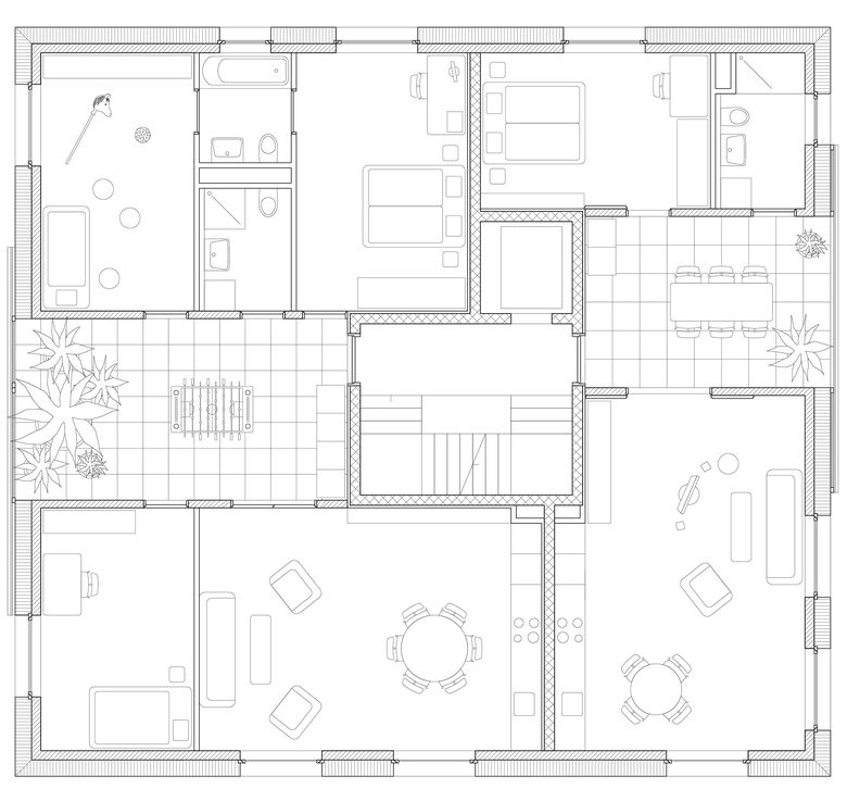 Im Innern gruppieren sich alle Wohnräume um ein grosses, zentrales Gartenzimmer, welches die Nutzflächen von Korridor und Loggia vereinigt. Im Sommer lässt es sich dank aussenliegenden Schiebefenstern in eine gedeckte Terrasse verwandeln. In der Übergangszeit bietet es zusätzlichen Wohnraum als Spiel- oder Esszimmer. Im Winter ist seine Temperatur leicht niedriger als in den beheizten Wohnräumen. Somit eignet es sich ausgezeichnet zum Überwintern der Pflanzen. Richtig kühl wird es allerdings nie, da es in der ausgezeichnet gedämmten Gebäudehülle mit einschlossen ist und hochwertige Verglasungen die wärmende Sonne einfangen.