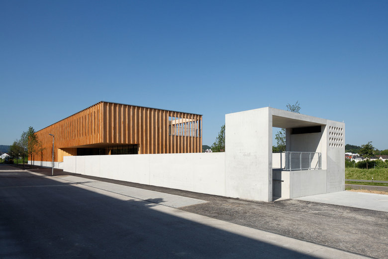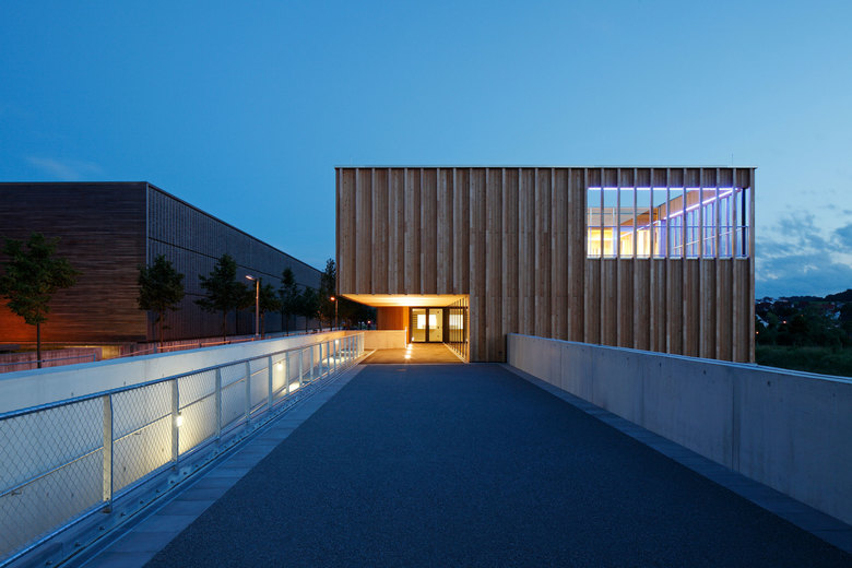 Das Gebäude mit seiner einheitlich, vertikal rhythmisierten Fassade aus Lärchenholz erhält seine unverwechselbare Eigenständigkeit durch einen Landschaftssteg, der in einen tiefen Gebäudeeinschnitt übergeht und am Haupteingang einen fließenden Übergang von Außen- und Innenraum herstellt, eine Dachterrasse, die den freien Blicke in die Landschaft ermöglicht und ein großes, in ein Labor Einblick gewährendes Schaufenster.