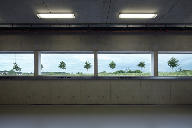 Durch Einbinden der Großlabore in die Topographie, fügt sich das Innovationszentrum maßstäblich in das Umfeld ein und lässt die Haupterschließung auf der Campusseite in ein großzügiges Foyer auf der mittleren Etage münden. Es fungiert als kommunikativer Knotenpunkt zwischen den auf drei Geschossen organisierten großräumigen Nutzungen - Labore für großformatige Versuchsanordnungen, Seminar- und Multifunktionsräume - entlang der Westfassade und der kleinteiligeren Struktur - Büros und Kleinlabore - entlang der Ostfassade. Die Flure in der Mittelachse des Gebäudes laden durch Aufweitungen und Tageslichteinfall im Bereich der Klimahöfe und der Dachterrasse zum Aufenthalt ein.