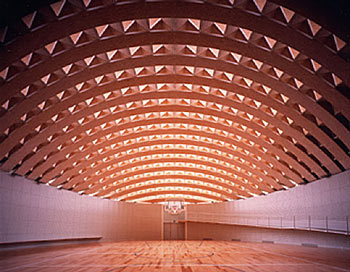 The project uses LVL (Laminated Veneer Lumber) as a structural system. The difficulty of the project was to create the form of a 20 m x 20 m oval dome. Since LVL is a difficult material to mold into a three-dimensional shell figure, the first suggestion was to curve the LVL into a two-dimensional arch, and set many of them in such a way as to form a tree-dimensional oval form. The structural point of the material was also a challenge. The question was how this arch could span 20 meters with the load of snow that this structure would have to bear during the winter. To provide stronger support, the solution was to compose a space frame with LVL. In the short direction a pair of arches are set parallel to each other and placed to form the oval dome. In the longer direction, another set of arches along the long side are sandwiched in between the paired arches along the short side. The arches along the long side are set at such an angle so that they work as lattice members. Just as paper could surprisingly be a structural member depending on how it is used, thin plywood (LVL) can also be a structural element, which spans a distance beyond expectations. With this solution much less wood is used than in an ordinary dome structure using other wood lamination.