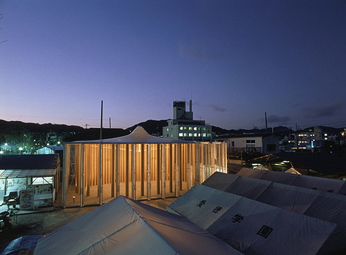 This community center was built by church volunteers whose house of worship was destroyed by Kobe earthquake in 1995. Materials were donated by a number of companies, and construction was completed in only five weeks by the 160 volunteers. The plan(10 x 15m) is enclosed within a skin of corrugated, polycarbonate sheeting. Within this, 58 paper tubes (325mm in diameter, 14.8mm thick, and 5m high), were placed in an elliptical pattern. The eclipse is based on those in Bernini’s church designs, and the space between the eclipse and the outer edge of rectangular-shaped site formed a corridor and provided lateral support. At the entrance to the eclipse, the spacing of the paper tubes was widened, and the facade fully glazed to form a continuous, unified space between the interior and exterior.This church was disassembled in June 2005 and all the materials were sent to a city in Taiwan.