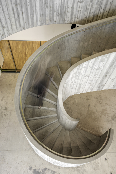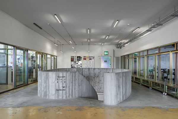 The large-format glass partition walls allow generous light distribution deep into the building core. The spiral exposed concrete staircase connects the wide entrance area with the floors below. The careful, reduced choice of materials produces a spatial atmosphere with an industrial feel: concrete, glass and yellow chromatised steel, together with acoustic sprayed plaster ceilings and textile ventilation ducts subtly complement each other. The dance school was expanded in 2019 with an enlarged cloakroom and four more dance studios matching the new design aesthetic.