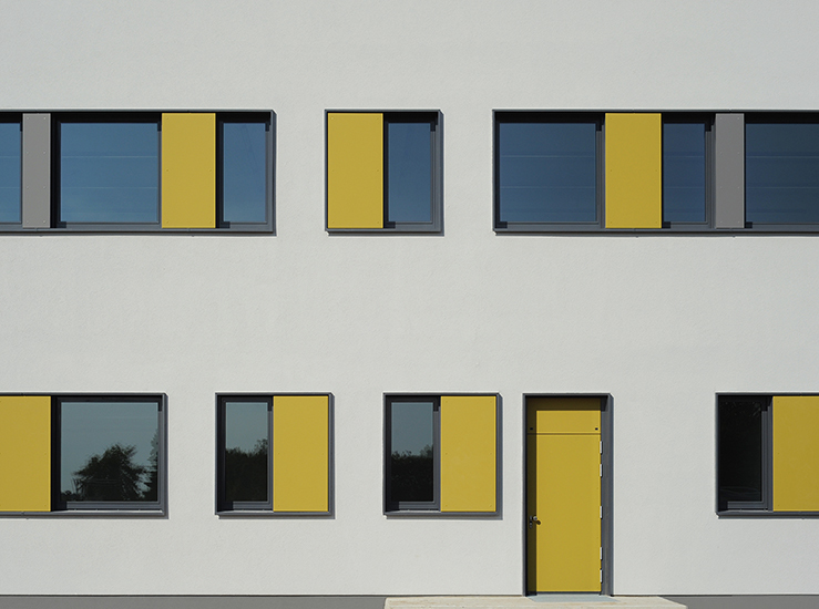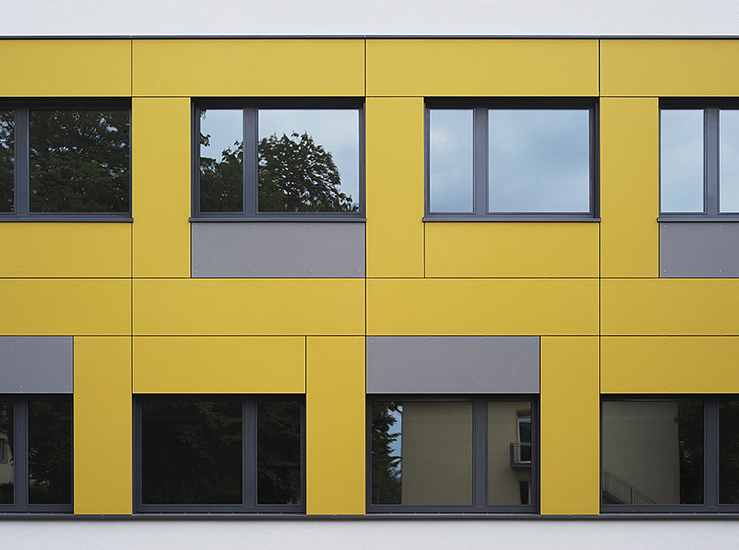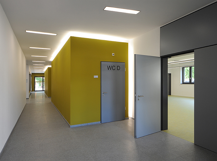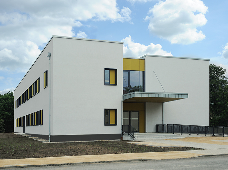 Der zweigeschossige Neubau hebt sich in seiner Funktion als Ausbildungs- und Versammlungsstätte mit neun Lehrsälen von den bestehenden Bauten der dreißiger Jahre als moderner Baukörper ab, nimmt jedoch die Proportionen der umliegenden Häuser auf.