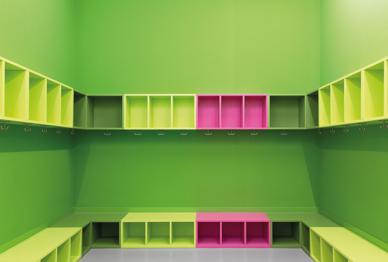 Das innere Erschließungssystem wurde entsprechend den Nutzungsarten neu geordnet. Jede Nutzung hat einen separaten Zugang erhalten. Die zwei vorhandenen Treppenanlagen zwischen Erd- und Obergeschoss konnten beibehalten werden. Das Untergeschoss erhielt einen neuen, innenliegenden Zugang. Besonders viel Wert wurde auf die detaillierte Wiederherstellung der Treppenläufe gelegt. Ein modernes Farbkonzept schafft Akzente im historischen Inneren.