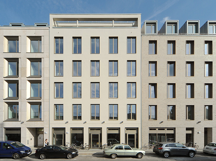 In der Fassadengestaltung wird die historische Parzellierung der Blockrandbebauung durch sechs Einzelhäuser aufgegriffen und durch unterschiedliche Materialien und wechselnde Traufhöhen betont.