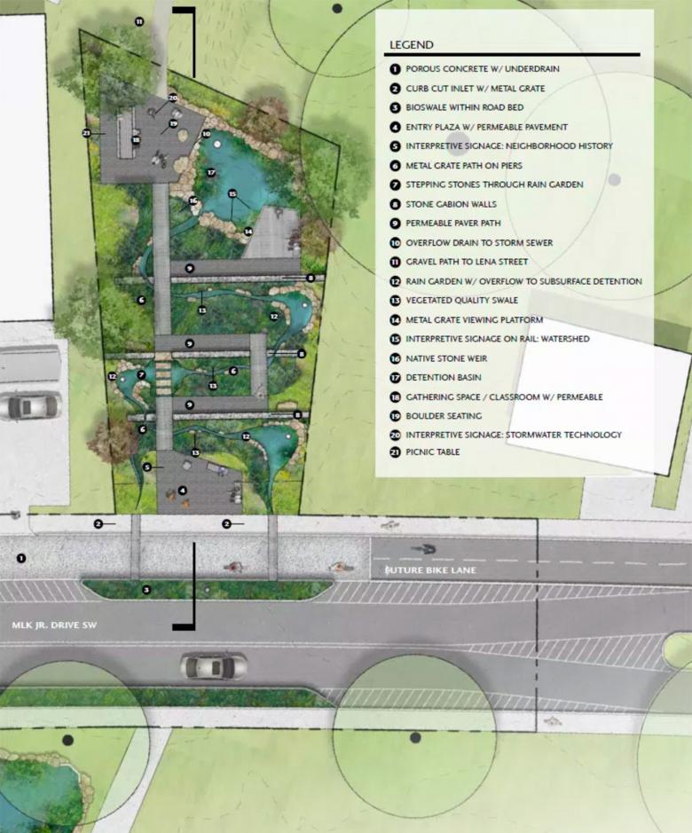 A winning entry in Atlanta’s Green Infrastructure Design Challenge, MLK Living Lab combines resilient, educational, and social strategies into a vibrant public space. The design centers on stormwater capture solutions that are legible and serve a pedagogical and economic function for students and local residents of this underserved community. Partnering with Spelman College and the West Atlanta Watershed Alliance (WAWA), Starr Whitehouse will integrate the site into existing educational and workforce training initiatives, such as classes in environmental science at Spelman, and vocational training at Atlanta CREW and the Green Infrastructure Resilience Institute. This strategy will not only posit the site as an education and economic engine for the community, it will also give the City access to maintenance support and performance metrics funded through existing community initiatives. Placing community involvement at the fore of the project, Starr Whitehouse will facilitate and implement feedback at every stage to ensure productive and ongoing use of the space, crafting protective elements that enhance the neighborhood that they defend.
