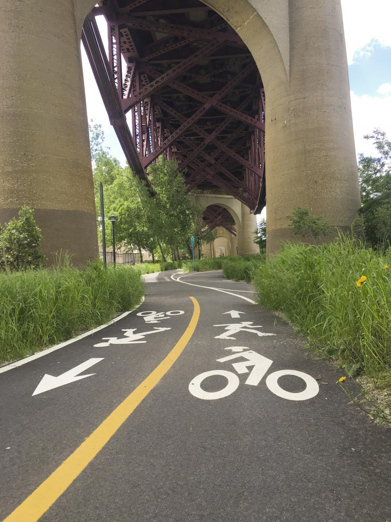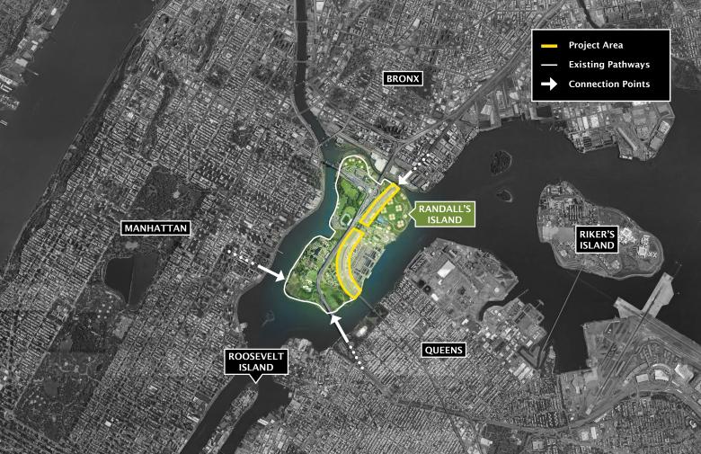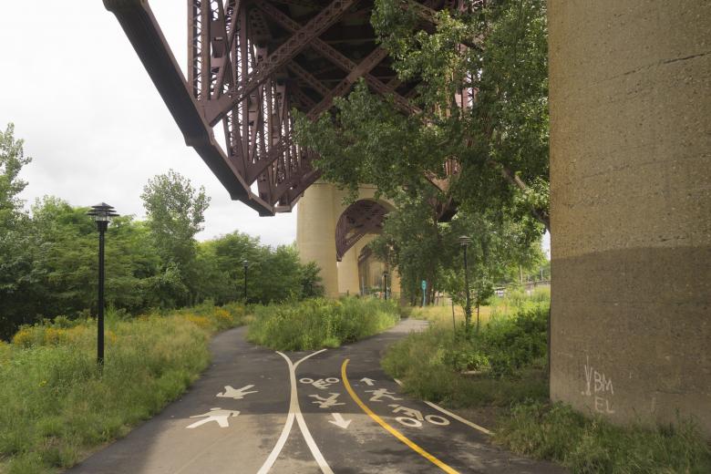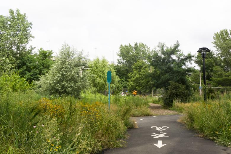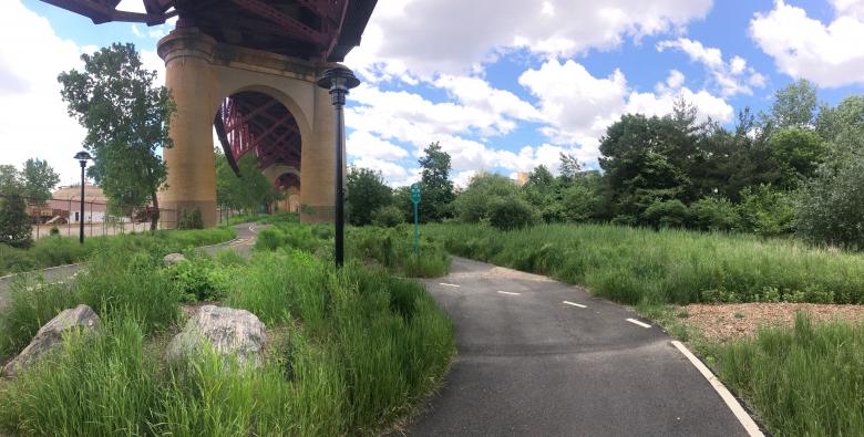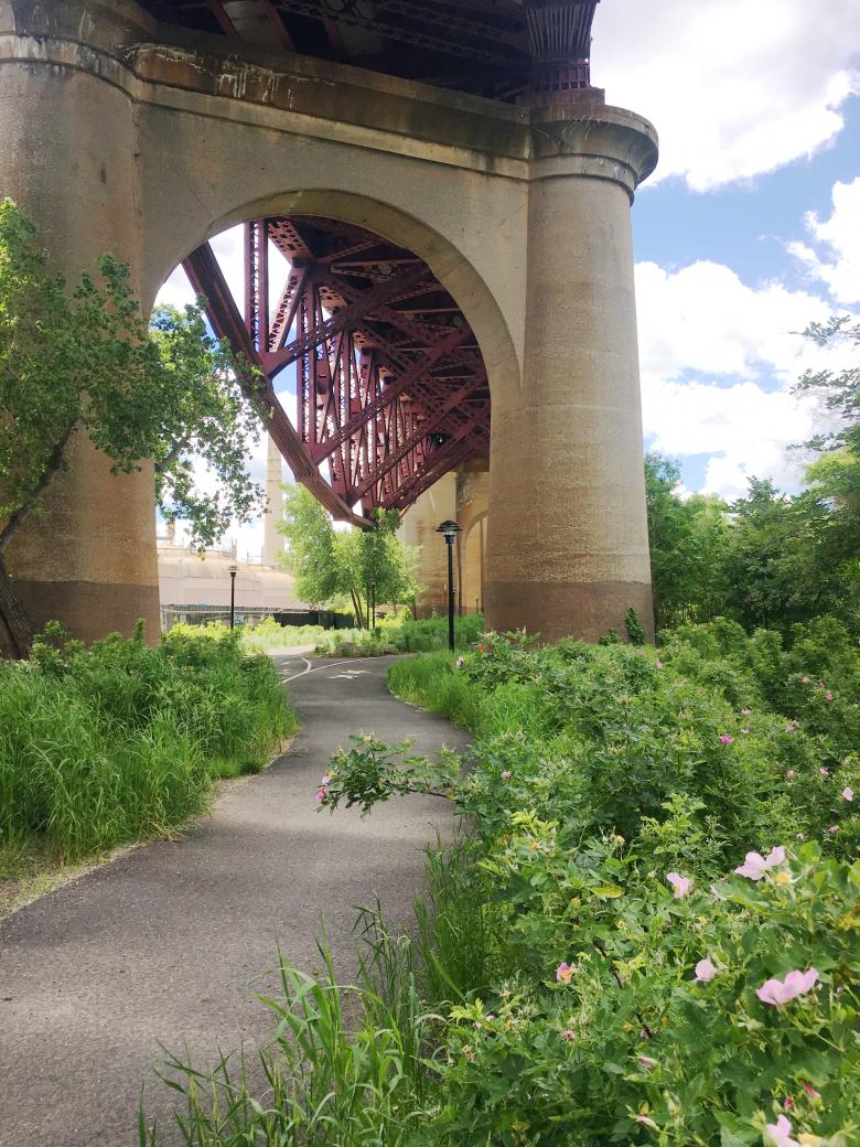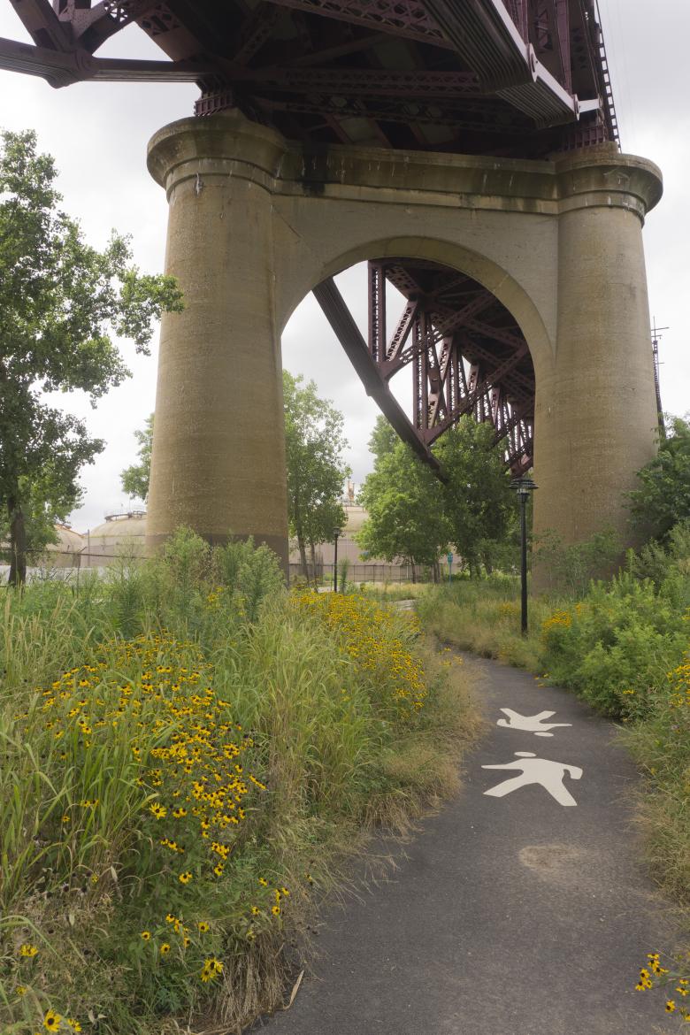 Threading under the strong sweep of the Hell Gate Bridge, the pedestrian and cycling pathway provides Randall’s Island with a circulation spine that connects recreational uses on the island and celebrates the industrial scale of the site. The beauty of the viaduct structure –its strong, tall arches– lends to a majestic pathway experience. The route celebrates infrastructure, running under the Amtrak trestle, passing by the FDNY Training Center and the Wards Island Water Pollution Control Plant, and viewing out to the ramps and spans of the Triborough Bridge. Starr Whitehouse’s design creates a linear sequence of landscape experiences that captures the diverse conditions on the island: mature and emergent woodlands, successional meadows, low lying wetlands, grasslands and river edge. The succession of native plant environments adds a new layer of ecological and scenic value to the island’s impressive infrastructure and redeveloped recreational facilities.