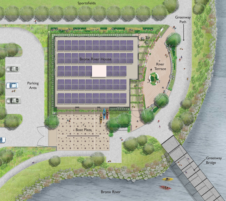 A collaboration with Kiss + Cathcart Architectsand, the Bronx River House supports the programs and environmental mission of the Bronx River Alliance. The building stores the Alliance’s canoes and kayaks, provides office, classroom and meeting spaces, and functions as a living part of the park. A steel mesh screen wall wraps the building, providing security and an armature for deciduous vines which modulate temperature. Roof photovoltaics and geothermal heating minimize energy use. Site stormwater is infiltrated to the ground or captured into a cistern for use for non-potable building systems and for irrigation.