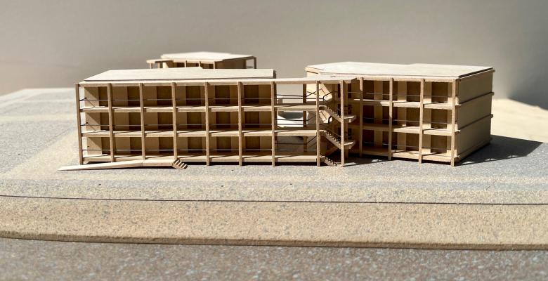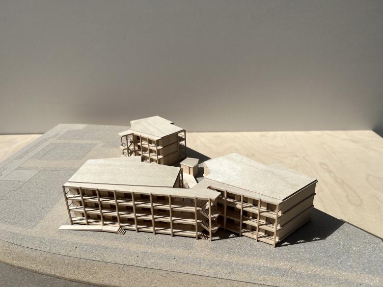 Zum herkömmlichen 1:500 Situationsmodell in weiss wurde noch ein detailliertes Holzmodell im M 1:200 eingereicht. Dies, um die Erschliessung und detaillierte Gestaltung der Fassaden und Laubengänge sichtbar zu machen. Der Raum zwischen den Gebäuden und zum nahen Gewässer kommt dabei zum Ausdruck.