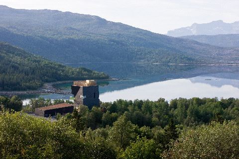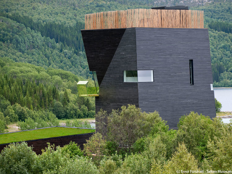 This center dedicated to Hamsun is located above the Arctic Circle near village of Presteid of Hamarøy and the farm where the writer grew up. The museum includes exhibition areas, a library and reading room, a cafe and an auditorium. The concept for the museum is "building as a body," creating a battleground of invisible forces. The stained black wood exterior skin is characteristic of the great wooden stave Norse churches. The spine of the building body is the central elevator, providing handicapped and freight access to all parts of the building. At the roof garden the long grass reflects the traditional Norwegian sod roofs in a different way. Strange, surprising and phenomenal experiences in space perspective and light will provide an inspiring frame for the exhibitions.