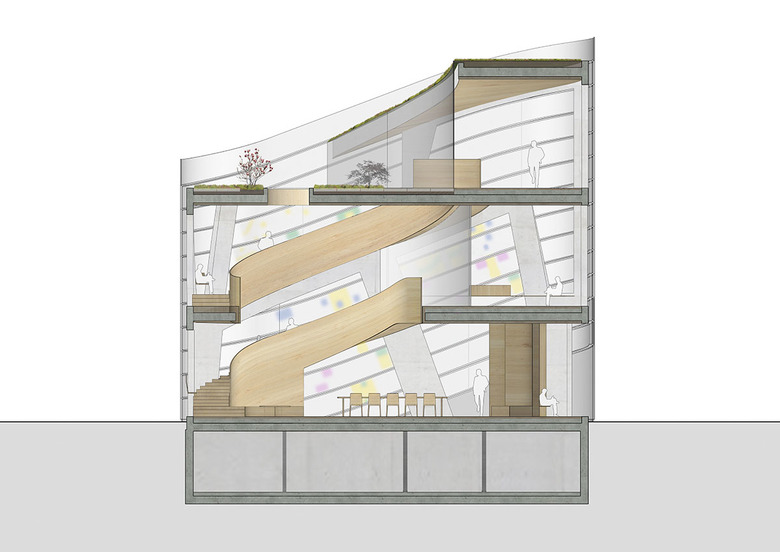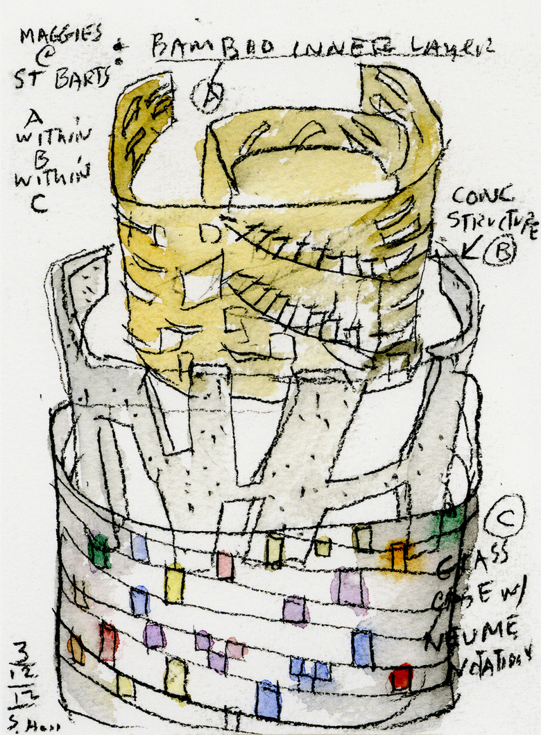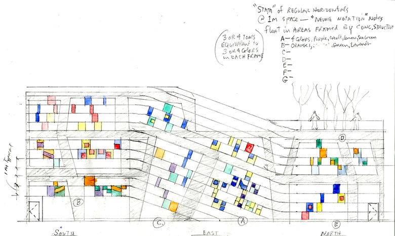 The building is envisioned as a “vessel within a vessel within a vessel.” The structure is a branching concrete frame, the inner layer is bamboo and the outer layer is matte white glass with colored glass fragments recalling “neume notation” of Medieval music of the 13th century. The word neume originates from the Greek pnevma, which means ‘vital force.' It suggests a ‘breath of life’ that fills oneself with inspiration like a stream of air, the blowing of the wind. The outer glass layer is organized in horizontal bands like a musical staff while the concrete structure branches like the hand.
