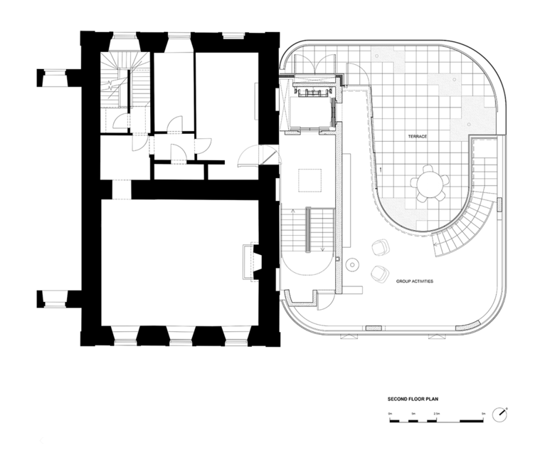 The three story centre has an open curved staircase integral to the concrete frame with open spaces vertically lined in bamboo. The glass facade geometry, like a musical “staff” is in horizontal strips 90cm wide, which follow the geometry of the main stair along the north facade, while lifting up with clear glass facing the main square, marking the main front entry. There is a second entry on the west opening to the extended garden of the adjacent church.