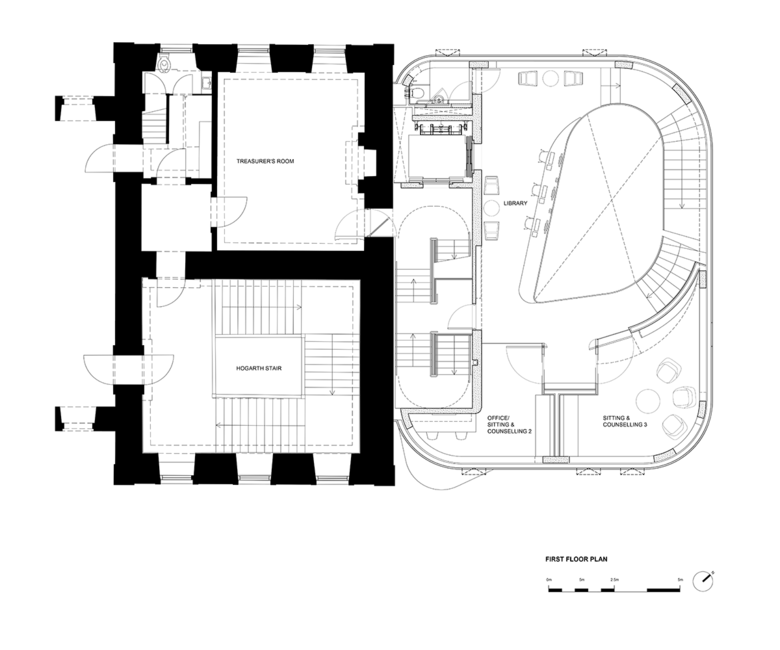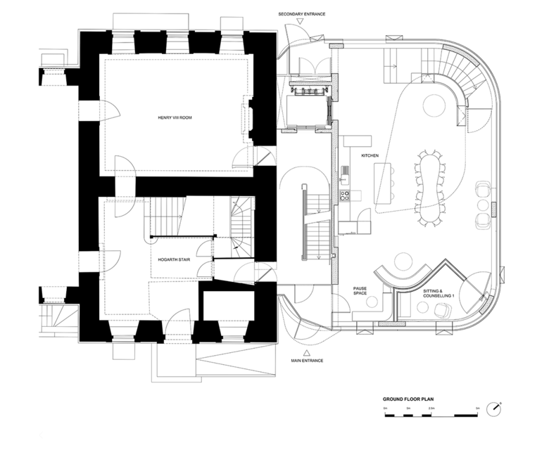 While most all of the realized Maggie’s Centres have been horizontal buildings, the centre at St. Barts will be more vertical, sitting on the historically charged site. It will replace a pragmatic 1960s brick structure adjacent to a 17th century stone structure by James Gibbs, holding the “Great Hall” and the famous Hogarth staircase.