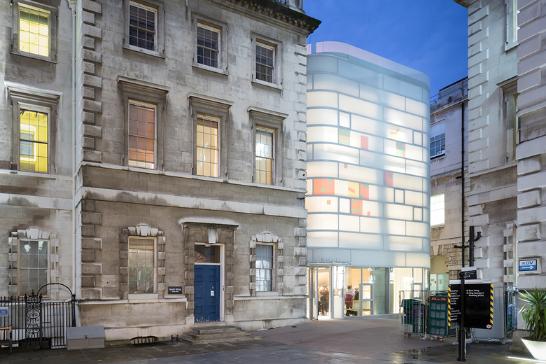 The building tops out in a public roof garden open to a large room for yoga, Tai Chi, meetings etc. The interior character of this building will be shaped by colored light washing the floors and walls, changing by the time of day and season. Interior lighting will be organized to allow the colored lenses together with the translucent white glass of the facade to present a new, joyful, glowing presence on this corner of the great square of St. Barts Hospital.
