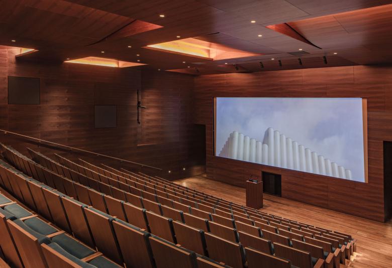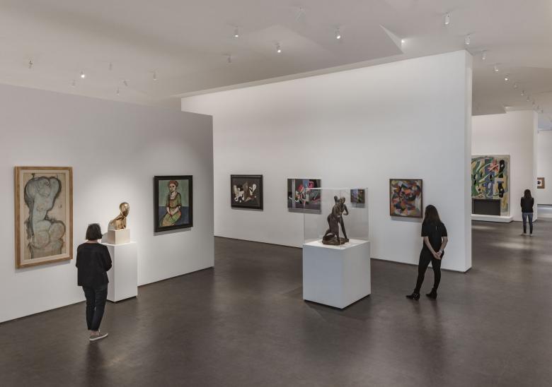Organized horizontally on two levels, all galleries have natural light and are flexible with open flow. The gallery rooms of ideal proportions are centered around an open forum. The open flow through galleries is punctuated by views into the seven gardens with green trellises offering shade from glare. The central gallery forum provides generous spaces for the exhibition of art and vertical circulation to the upper floors. A stepped ramp and elevators link the lobby and gallery levels for direct access to all galleries.
