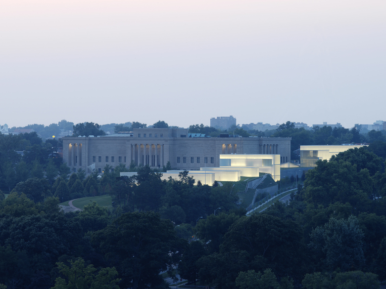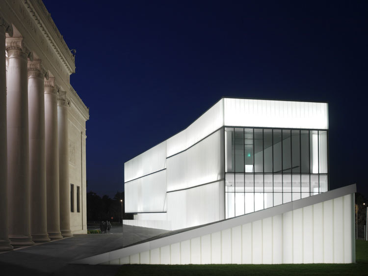 This competition winning addition is composed of five interconnected structures as opposed to a single massive expansion. Traversing from the existing building across its sculpture park, the five built "lenses" form new spaces and angles of vision. From the movement through the landscape and threaded between the light openings, exhilarating new experiences of the existing Museum will be formed. Circulation and exhibition merge as one can look from one level to another, from inside to outside. The "meandering" path in the sculpture garden above has its sinuous compliment in open flow through the continuous level of new galleries. Glass lenses bring different qualities of light to the galleries while the sculpture garden's pathways wind through them.