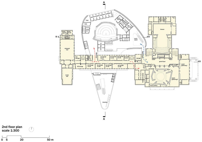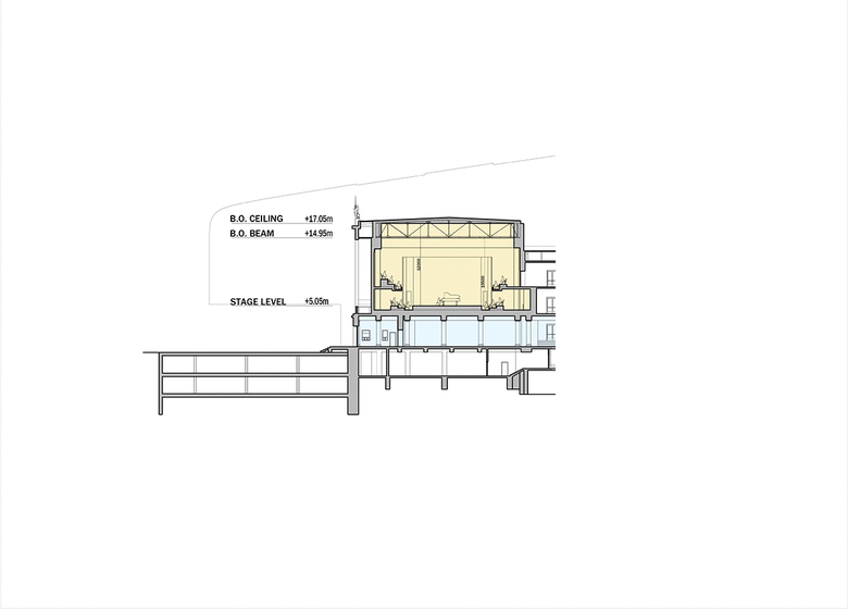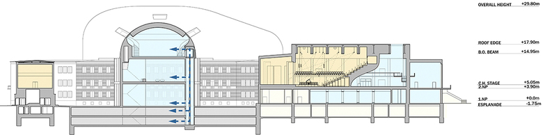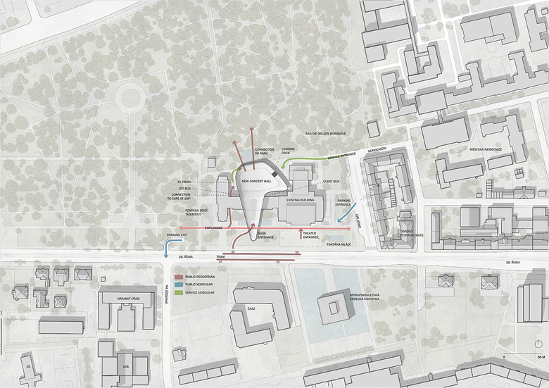 Urban traffic noise is shielded by positioning the hall facing the existing park on the building’s rear, while a new entrance on the promenade rises to glide over the top of the existing historical Cultural Center in a sky-lit lobby for the new hall. A dramatic complimentary contrast between new and old creates a cultural landmark for Ostrava.