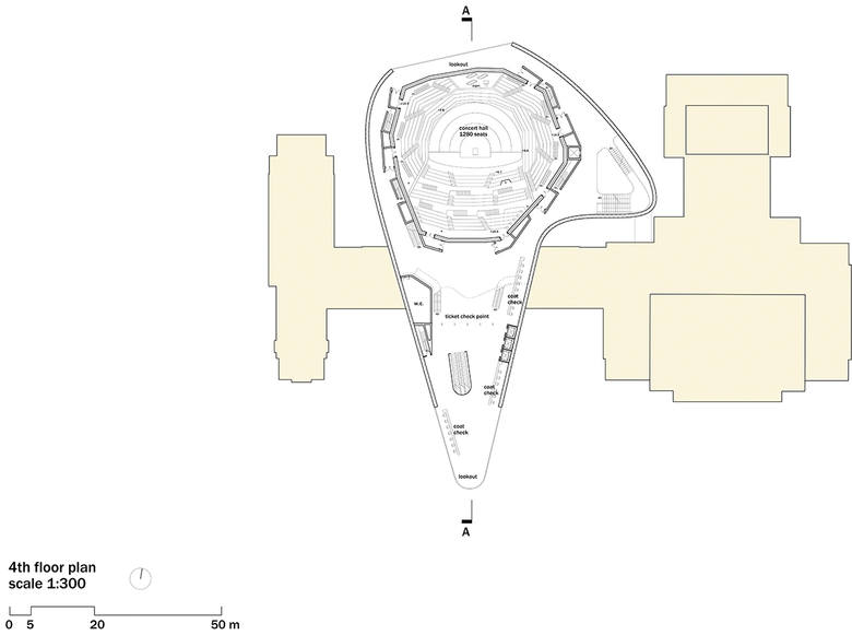The smooth case of zinc holds an “instrument” in an extended vineyard-type plan made of concrete and maple wood. Czech composer, Leoš Janáček’s theories of time will guide and give order to the concert hall’s interior geometry. Acoustic wall panels are organized according to scasovani, or rhythm, in three variants.