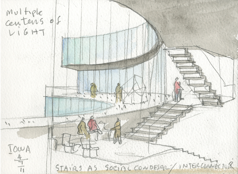 The Visual Arts Building replaces an original arts building from 1936, which was heavily damaged during a flood of the University of Iowa campus in June 2008. The new building forms an Arts Quad with Art Building West, which was designed by Steven Holl Architects and has drawn students from all over campus to its social spaces and library since opening in 2006. Together they form a visual arts campus for theorizing, teaching and making art.