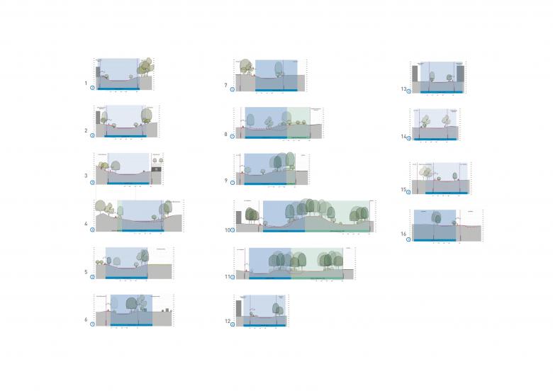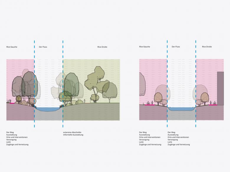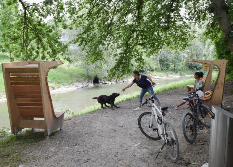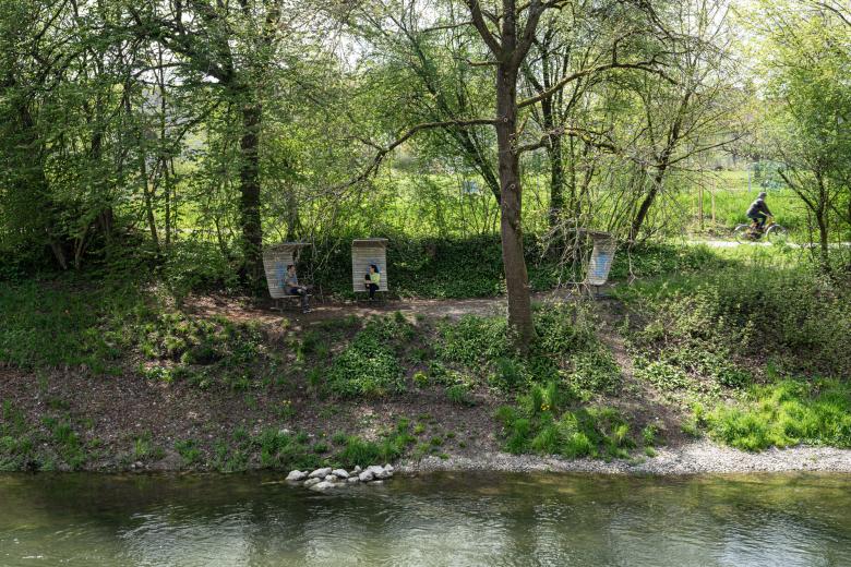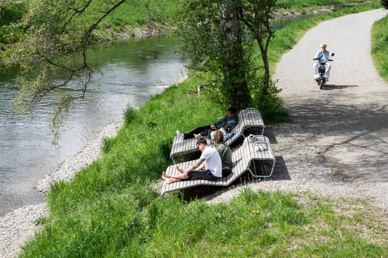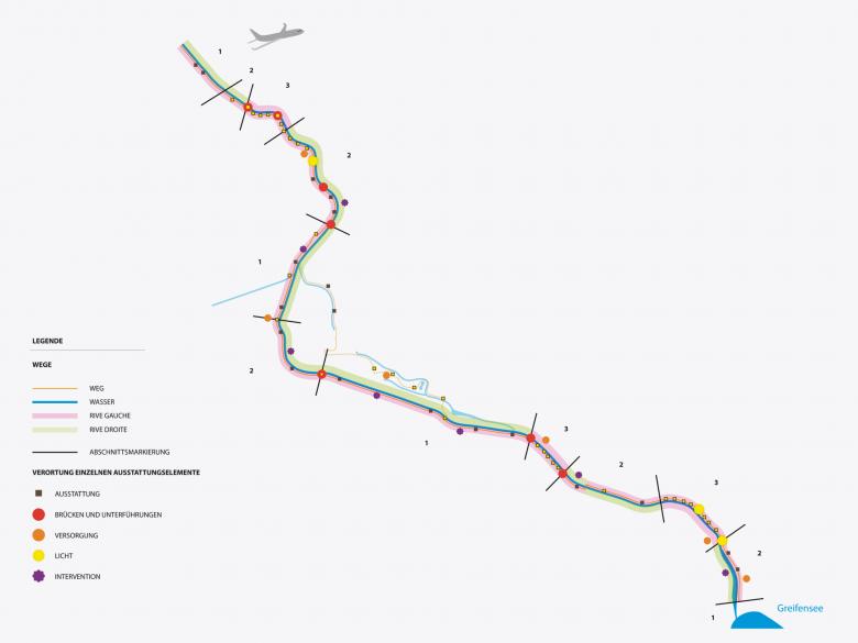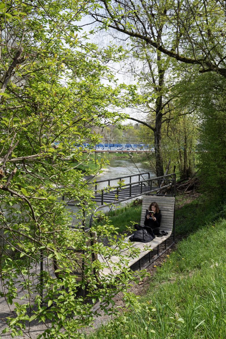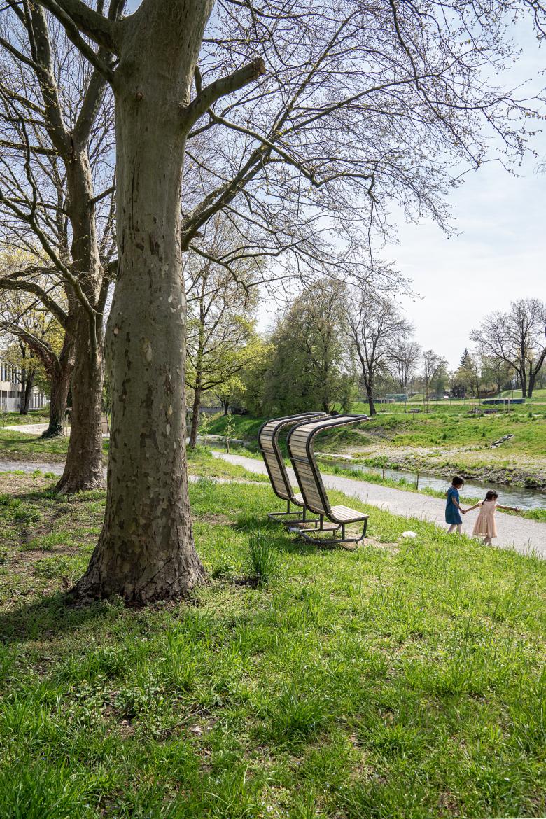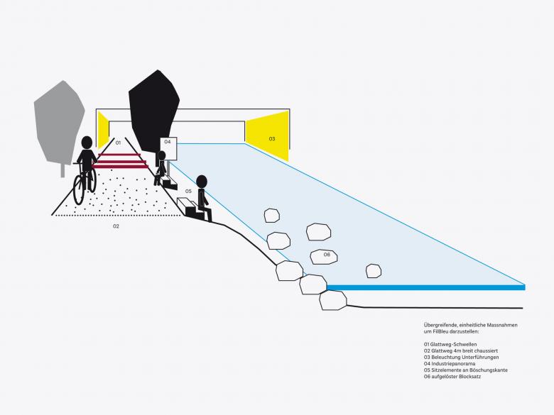 Mit der Integration von wiederkehrenden Gestaltungselementen wird die Identität des Flussraums als gemeindeübergreifender zusammenhängender Parkraum um den Fluss gestärkt. Sitzelemente mit Bezug zum Wasserlauf sowie Treppenbänder bilden Aufenthaltsräume direkt am Wasser. Eine Beleuchtung betont die charakteristisch hohe Anzahl von Brücken und sichert sie in der Dunkelheit. Zusätzlich wird mit der Installation von temporären Möblierungselementen die langfristige Zeitschiene des Projektes gebrochen. Der Flussraum wird schnell als Erholungsraum sichtbar und erlebbar gemacht. Innerhalb dieses Regelwerks schreitet der Wandel des Flussraums der Glatt weiter fort. Er ist jedoch nicht nur Teil einer fortschreitenden baulichen Siedlungsentwicklung, als gesamtheitliches Freiraumelement ist er Teil des übergreifenden Natur- und Stadtraums.