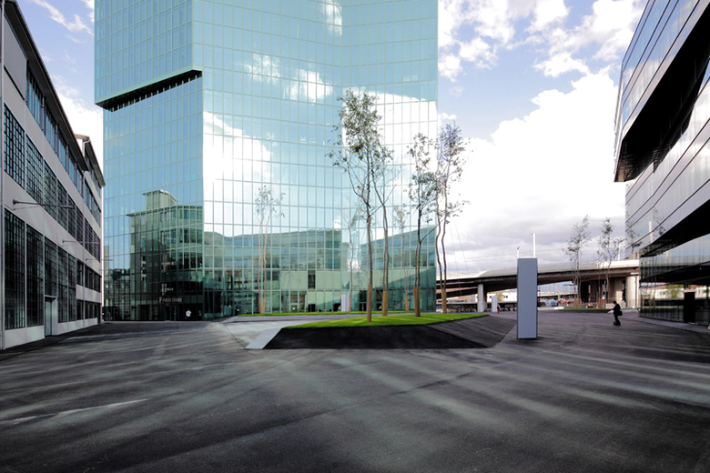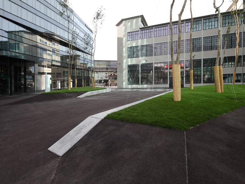 In dem weitläufigen Verkehrs- und Stadtraum zwischen der Hardbrücke, den Bahngleisen und dem Maag-Areal liegt der Primetower, der verspiegelte Hochhausturm, der die Silhouette Zürichs prägt. Aus diesem Kontext, aber auch aus den Nutzungsanforderungen heraus wird der Aussenraum um das Hochhaus zum fliessenden Platzbereich. Zwischen dem Prime Tower, den Gebäuden "Platform", "Cube" und "Diagon" geht er nahtlos in den offenen Innenhof über.