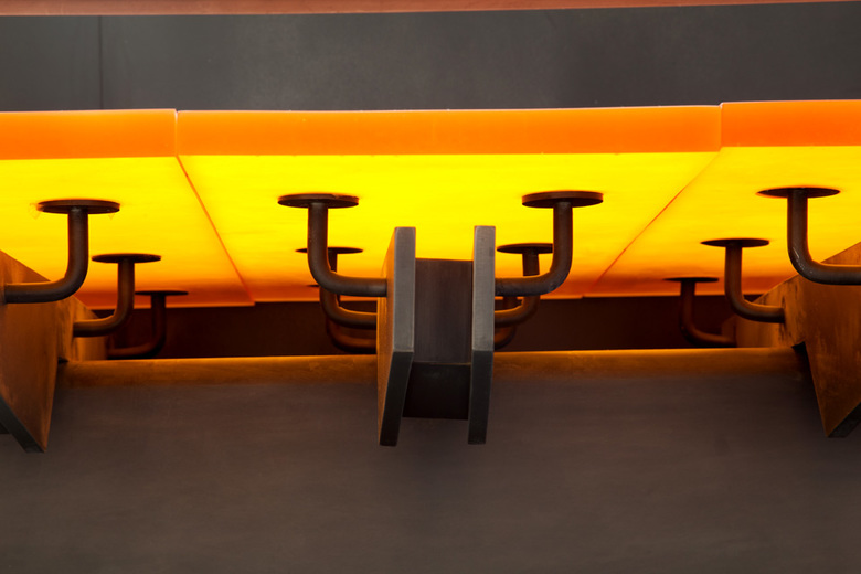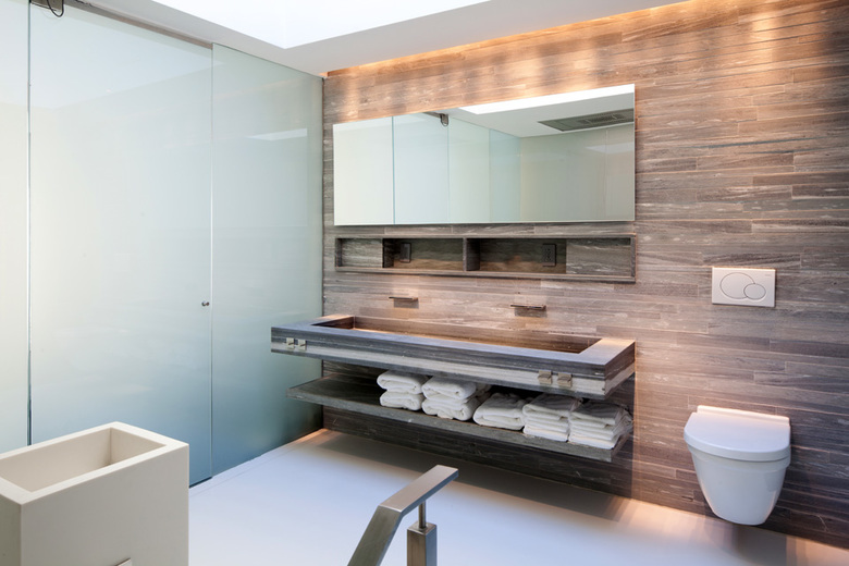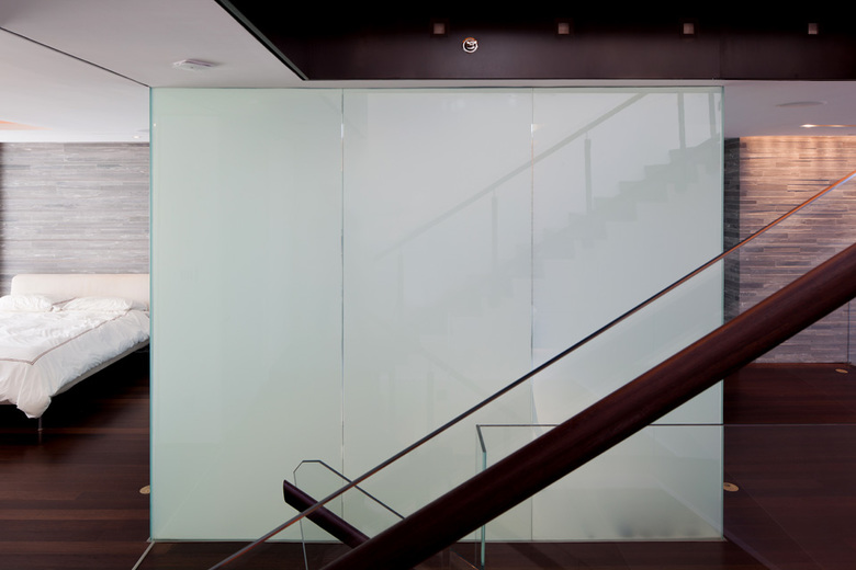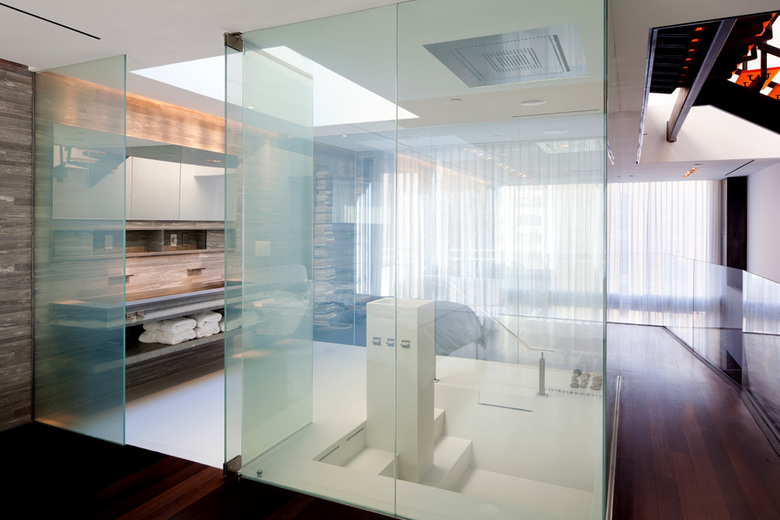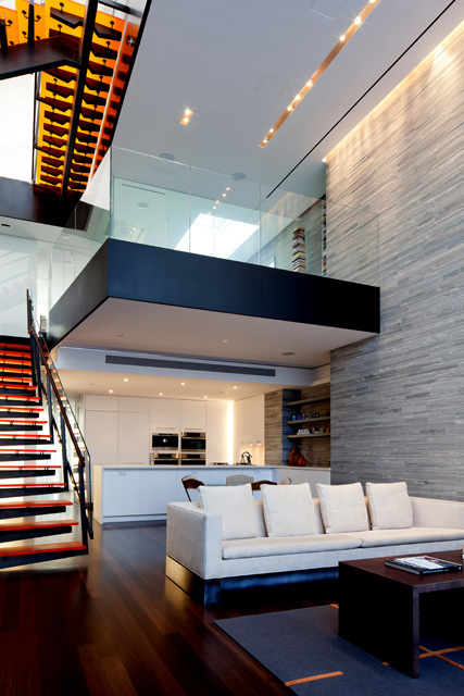 Other striking features are the stairs, made of black oxidized steel, which tie the three levels of the home together. Near the top, the steps lead to a “bridge” suspended over three stories, providing a dramatic view of the space. A clear glass box containing a full bathroom resides between the master bedroom and the study on the second level; when privacy is required, an inner layer of the glass can be activated to turn the walls opaque. On the third level, a lounge looks out onto an idyllic landscaped roof terrace and sun-deck; the ultimate escape from the city.