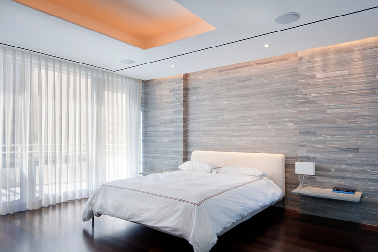 Designed for a single owner, this 2,400 square foot triplex apartment in a new condominium development on East 73rd Street is full of air and light. Working closely with the building architects, TCA has designed a soaring, dramatic space with double-height entry foyer and a large living room with a custom fire trough that runs along the length of the space. A unique feature of the condominium is the two-story Vals quartzite stone wall that runs along the west side of the apartment, with stones that were handpicked by the owner and architect from a remote Swiss quarry. Cantilevered built-in shelves create a table and night stand, while niches in the stone wall are reserved for the client’s various toiletries.