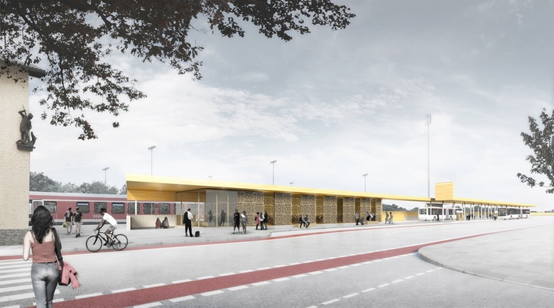 Kernidee des Entwurfes ist die Anordnung von Bahnhofsgebäude, Busbahnhof und Fahrradparkhaus um einen neuen Bahnhofsvorplatz. Das Dach wird als Band inszeniert, das die einzelnen Elemente des Entwurfs zusammenbindet und gleichzeitig einen witterungsgeschützten Übergang zwischen allen Bereichen gewährleistet.
