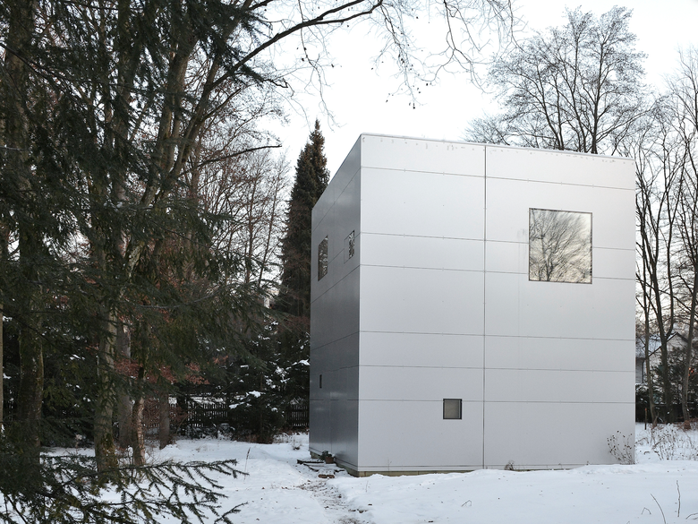 Konzeption einer Kate als Arbeits- und Wohnmodul für einen Schriftsteller in einem großzügigen Gartengrundstück mit alten Bäumen mitten in München. Ein metallener Würfel mit einer Seitenlänge von 7 Metern. Die Kate ist auf die wesentlichen Funktionen von Arbeiten und Wohnen reduziert.