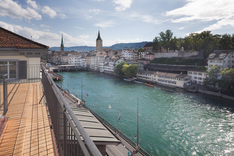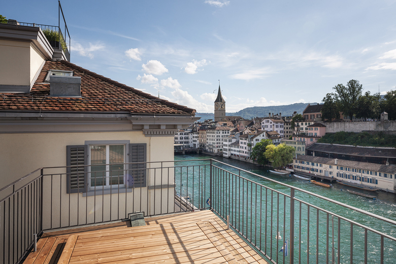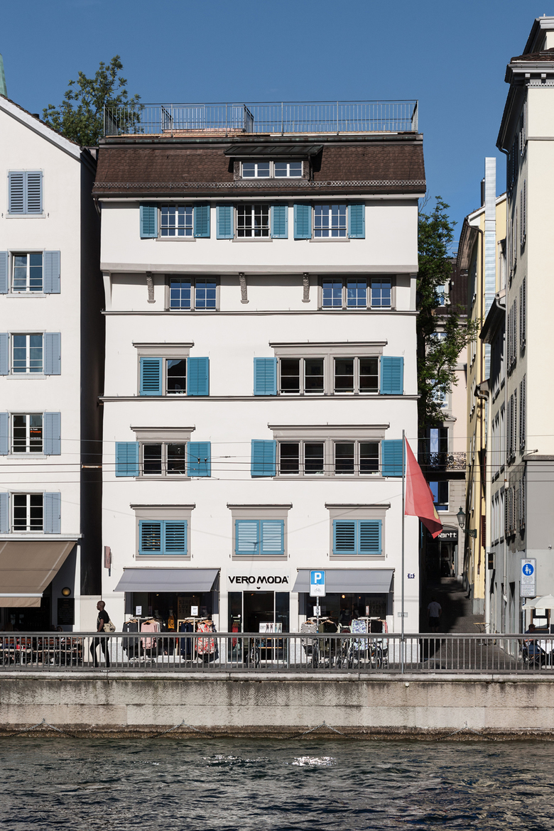 Fassadenrenovation und Ausbau Dachwohnung eines denkmalgeschützten Altstadthauses am Limmatquai in Zürich.