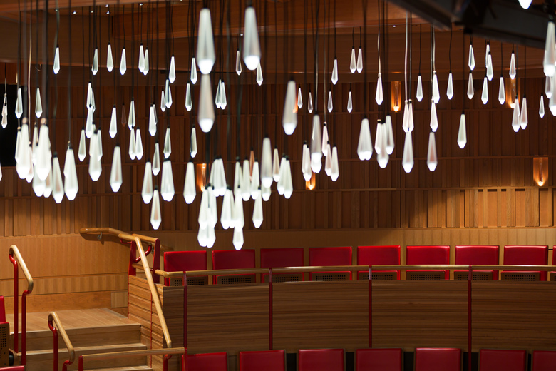 Das Herzstück des Neubaus ist das Main Theatre und befindet sich im Innenhof des historischen Gebäudes. In der Royal Academy of Music finden Lehre und öffentliche Konzerte statt, daher schafft das Licht sowohl eine inspirierende frische, als auch eine festliche Atmosphäre. Im Main Theatre bestehen die Wände und die Decke aus Kirschbaumholz, erinnernd an den Körper eines Saiteninstruments. Ein Kronleuchter, dessen Licht und Kristalle sich genauso wie die Musik im ganzen Raum ausbreiten, verbreitet ein funkelndes Licht. An den Wänden setzen sich die leuchtenden Kristalle fort. Glasfaser schickt das Licht in die Kristalle von den Projektoren aus, die sich wartungsfreundlich im Technikraum befinden. Das festliche Licht begleitet den Besucher zur Studiobühne auf dem Dach. LED- Leuchten mit Glaslinsen zeigen die Distanz zwischen Alt-und Neubau.