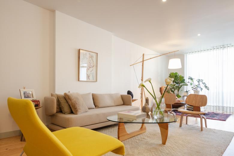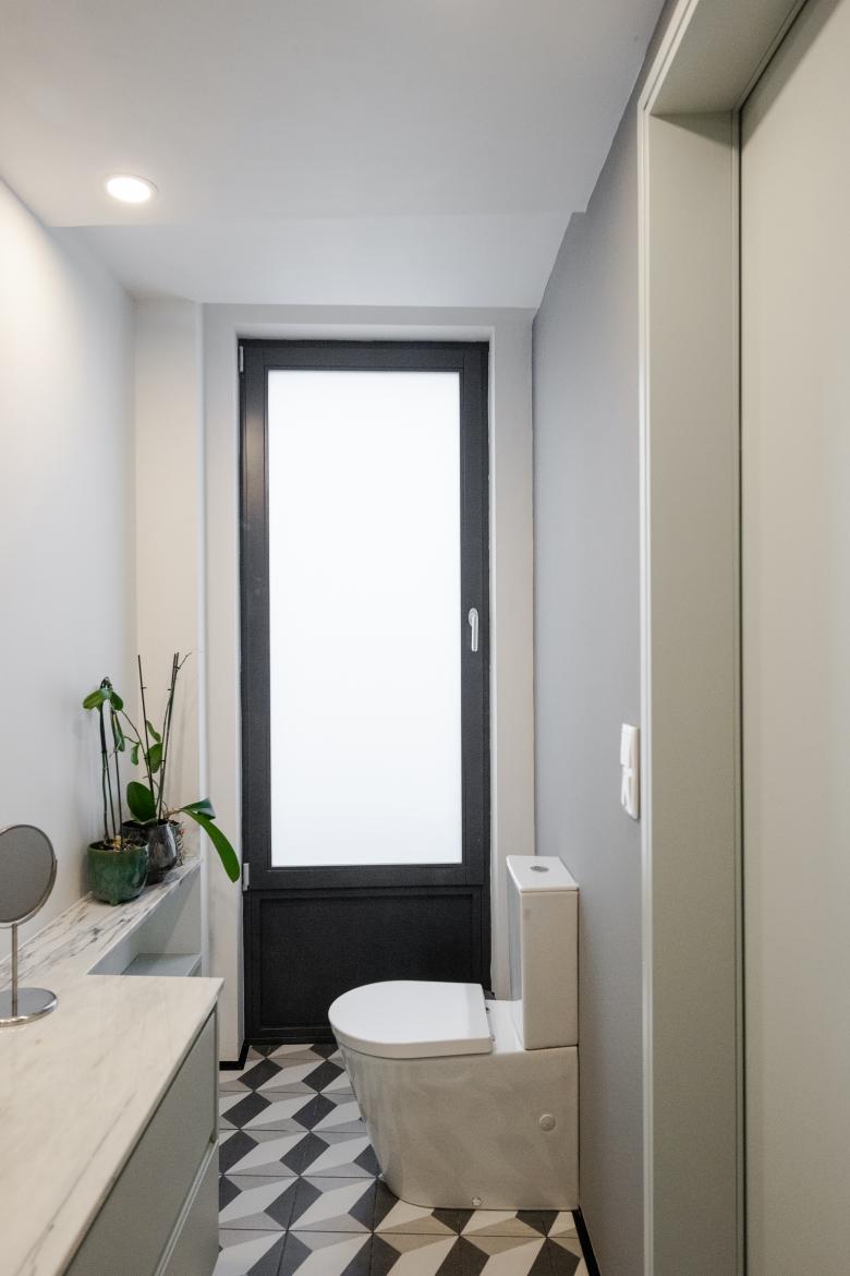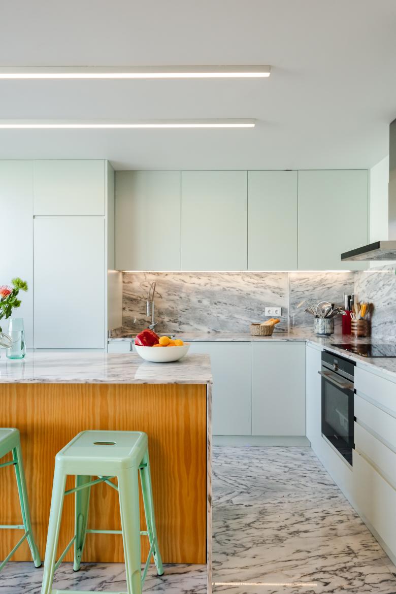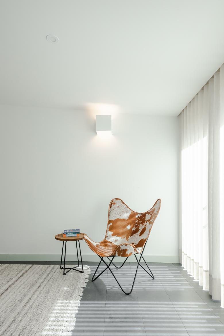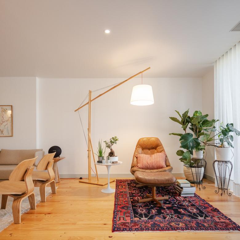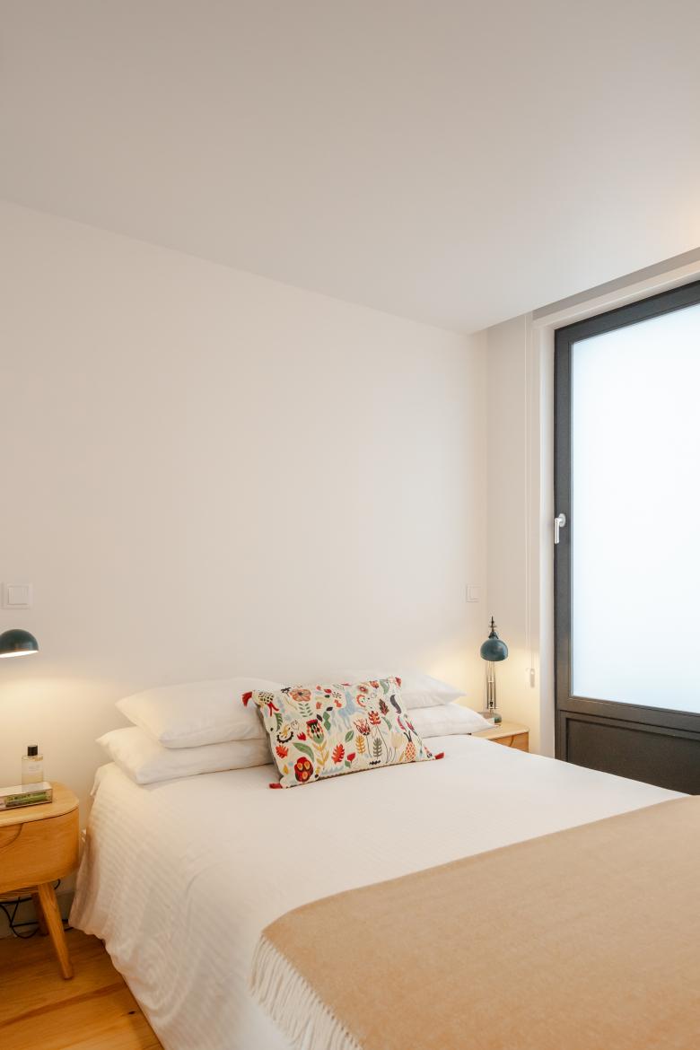 The apartment itself is the ground floor unit in a building designed by the well-known Pedro Ferreira Architecture Studio and where two one-bedroom apartments were originally located. Our project transformed the two T1 into a T3 (three bedrooms) and that is why the floor plan has a U-shape, surrounding the common stairwell.