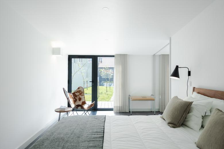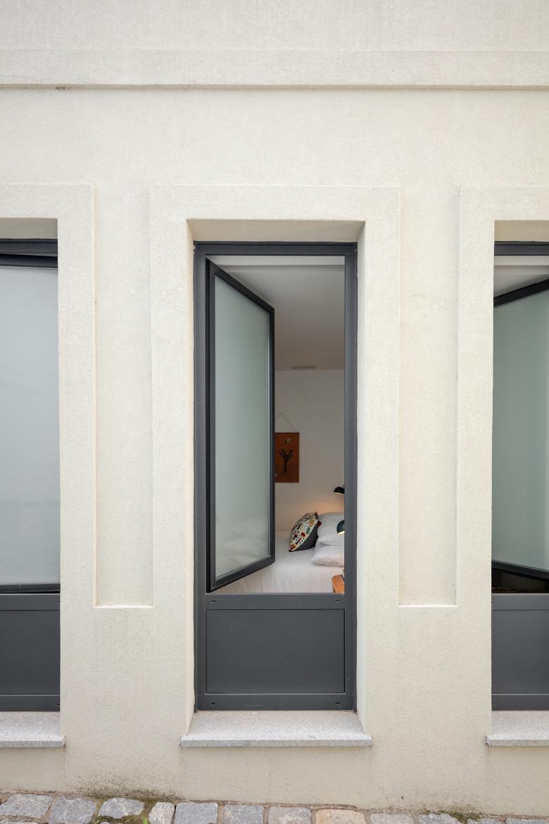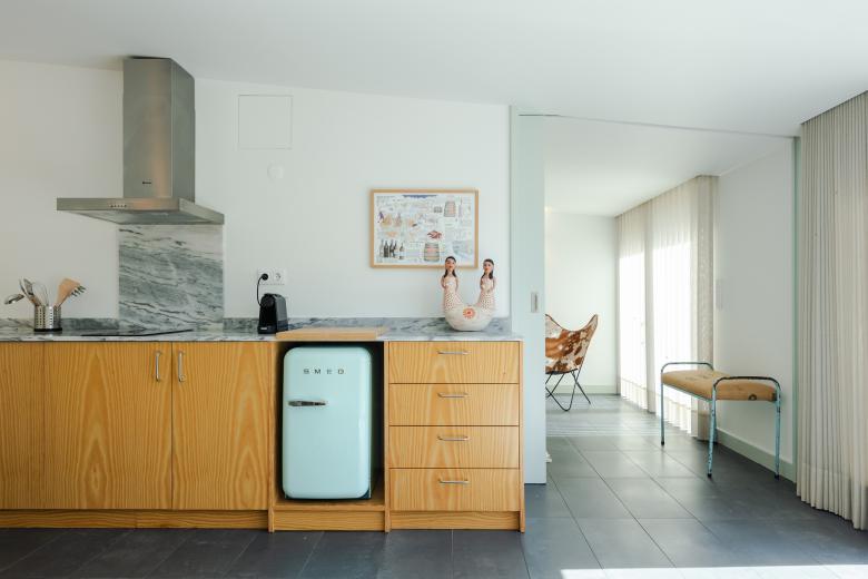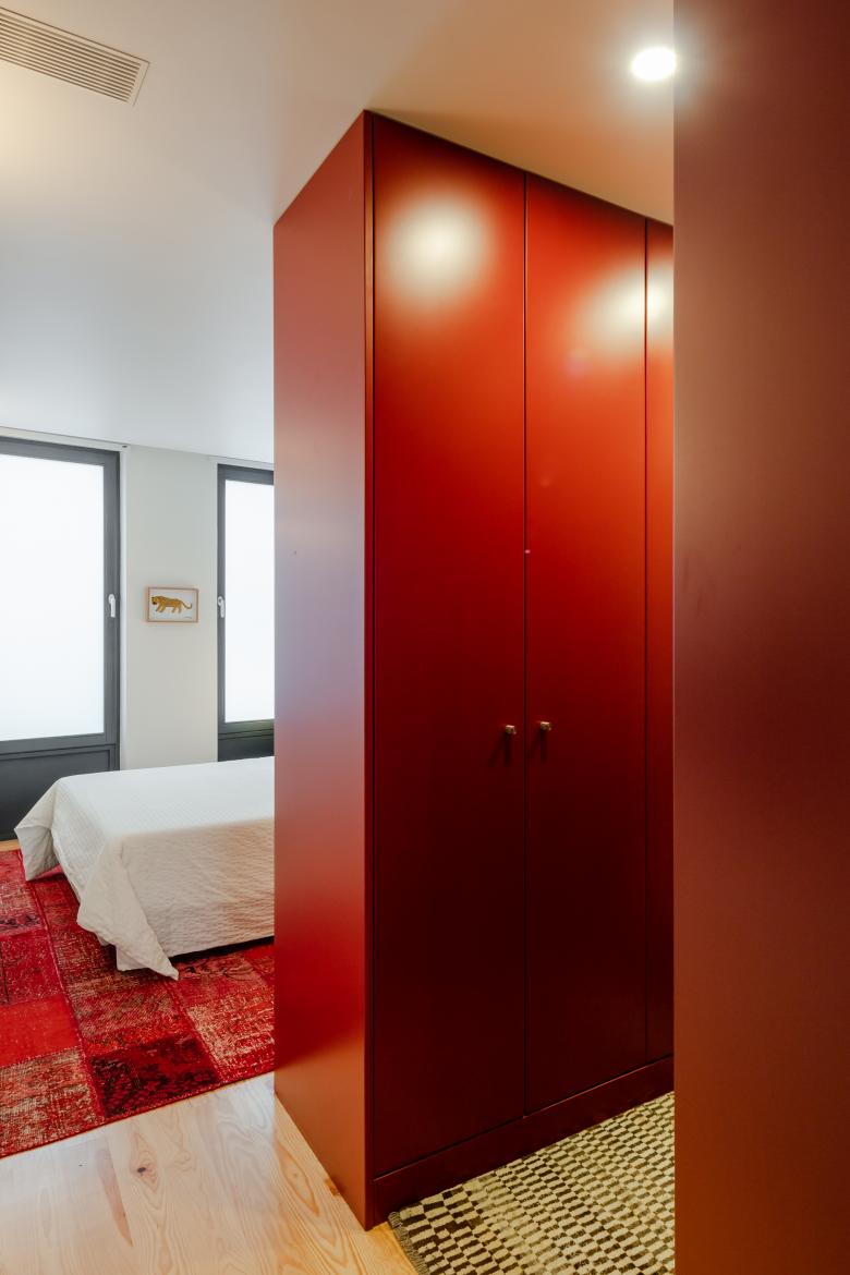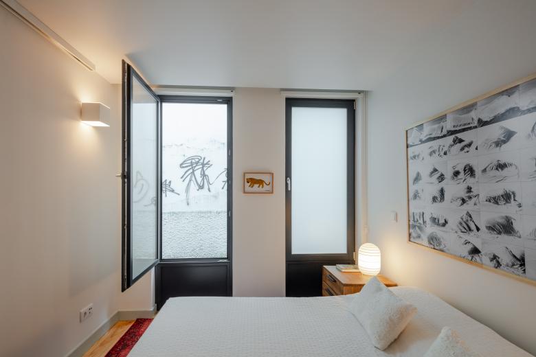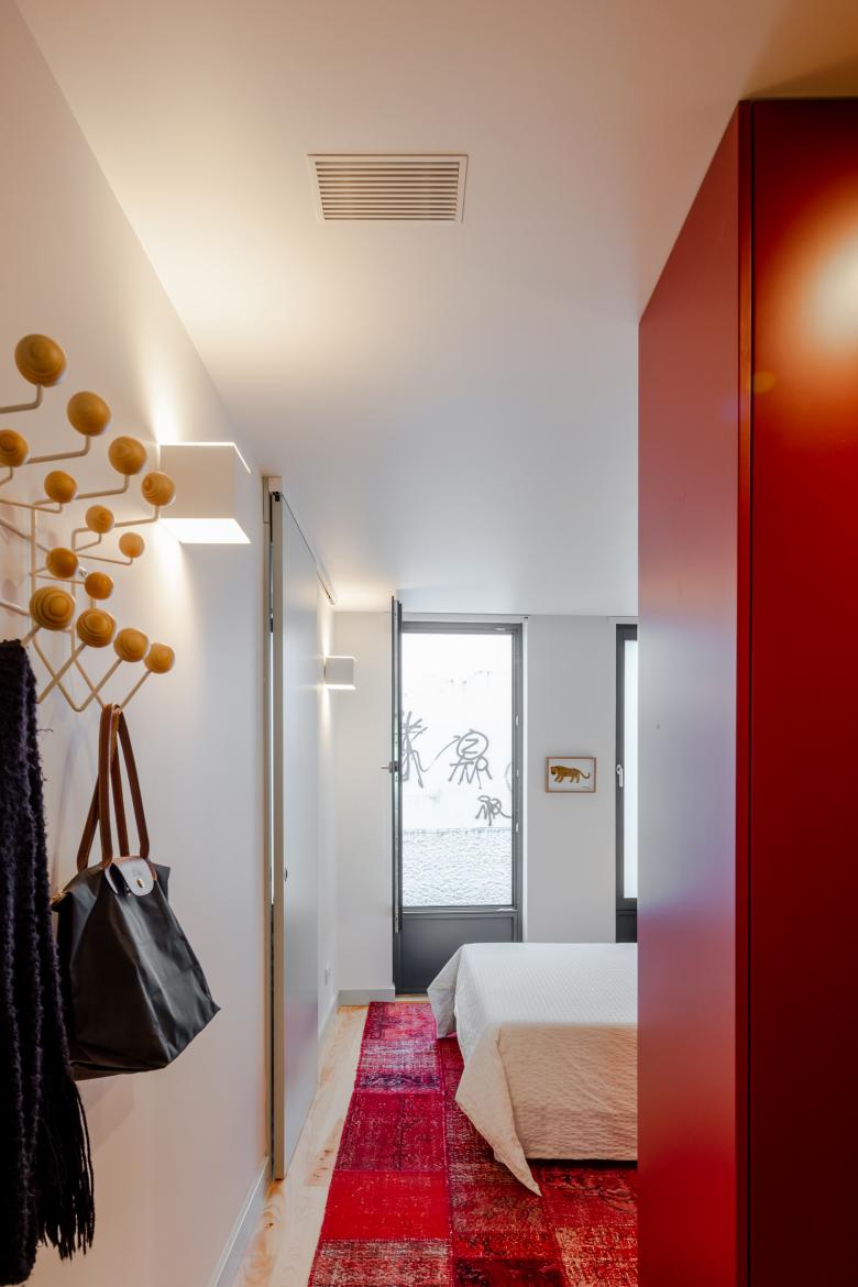 The suite's room is dominated by the red tone, the kitchen is structured by water-green cabinets in a typically Portuguese configuration, and the bathrooms are marked by the geometric floor in a neo-concrete pattern. And, common to all rooms, an abundant natural light that comes from the graffitied alley and the secret garden.