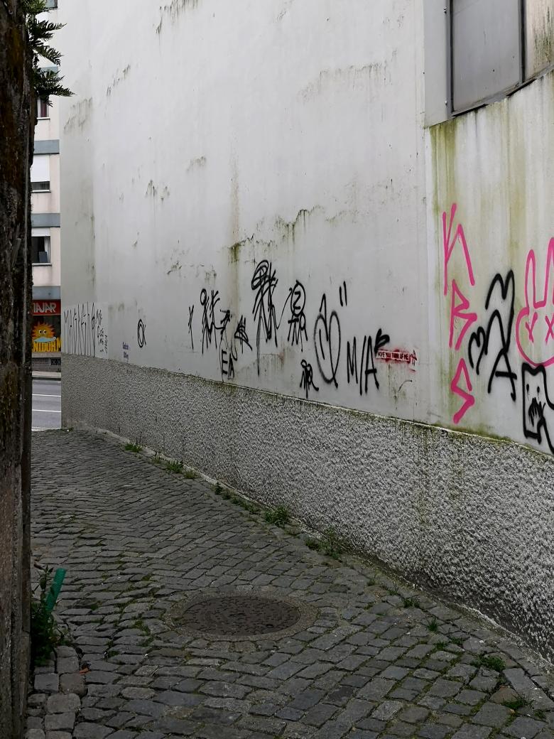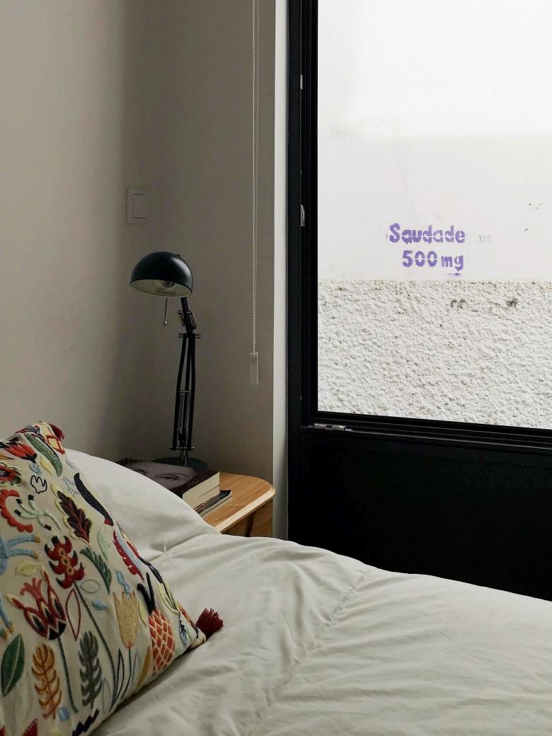 The second illuminating space is Travessa da Regeneração, a narrow alley that has some sections marked by local graffiti artists. One of them could be the artist Add Fuel, who would have applied the stencil "Saudade 500 mg" (Longing 500 mg) right in front of the window of one of the apartment's rooms. Others left intentionally non-copyright drawings and doodles. Saudade 500 mg, a melancholic and coded message, uses this unique word from the Portuguese language and says a lot about a country that suddenly opened up to the tourism industry and to foreigners from Portuguese-speaking countries. Other messages in the region reflect the side effects of this industry ("Tourist go home"), manifestos and calls ("Against the rising cost of living, join in"), and still others that are surprisingly sympathetic ("Today is a good day!") or loving ("I love you, Cristina"). The fact is that the small chaos of these phrases that appropriate the urban space is in a very narrow stretch of Travessa – it is less than three meters wide -- and is stamped on a wall towards which the rooms in the intimate part of the apartment face (the three bedrooms). That is, it is an unexpected short circuit between the domestic and the public.