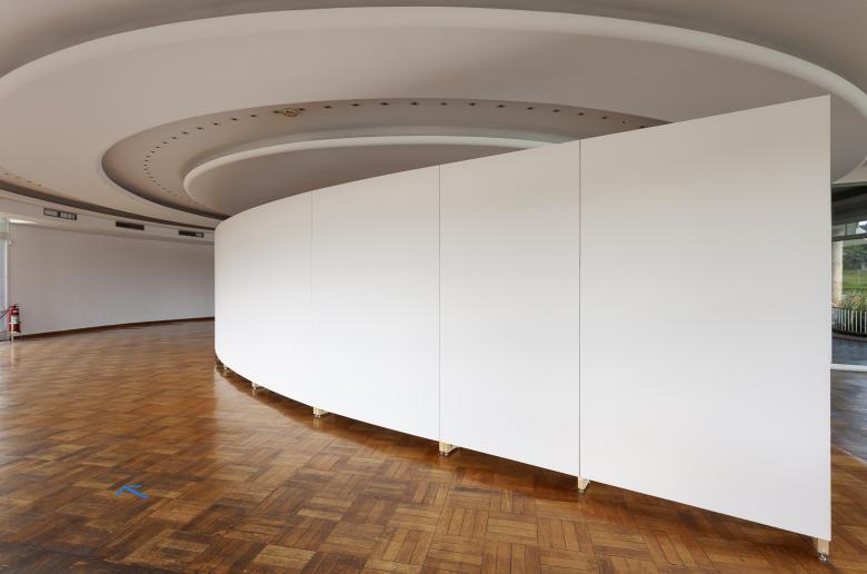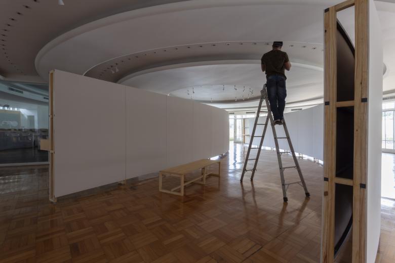The floor plan of Casa do Baile’s hall is circular, and its circle is defined by a sequence of masonry and glass arches. Like the exhibition we propose, which is also made of arches. In dialogue with the limits of the hall, they define new concave and convex environments, or curved spaces within a curved space. They are panels that dialogue with CB’s architecture and add movements to the exhibition, inducing the visitor to go through the four sides of the arches and creating different passages of space – either narrow or open and wide.