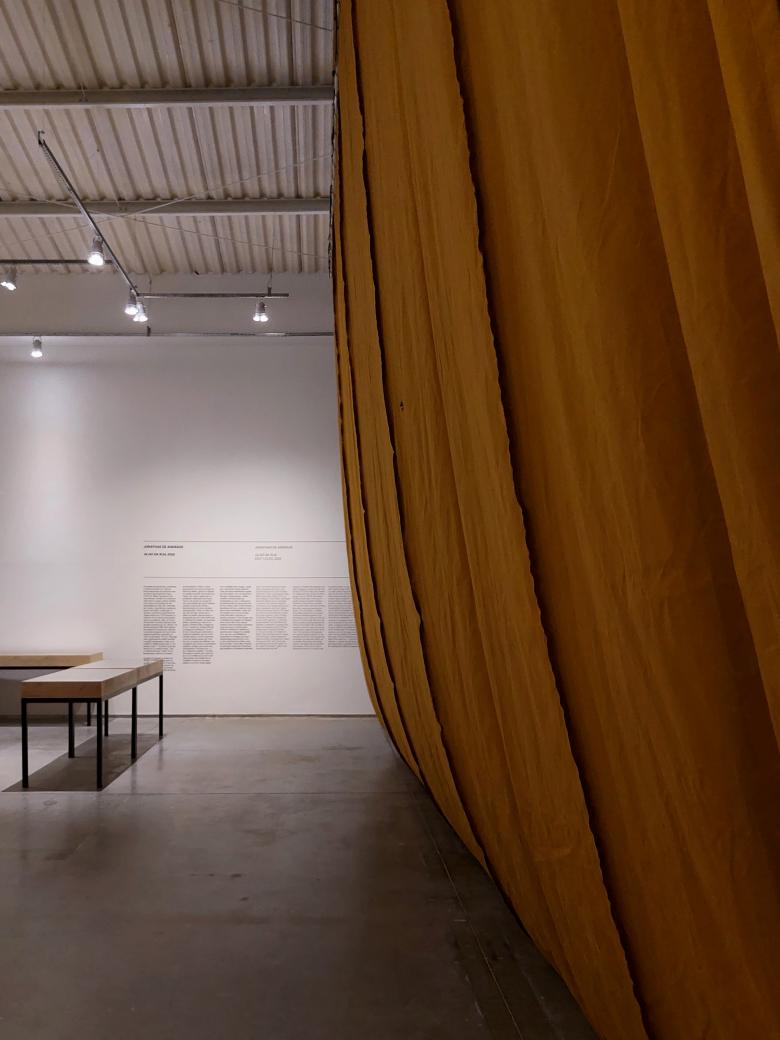 This ending is marked by the plain curtain in the second room. It is a curved surface that defines a “U” shaped gourd for the projection of “Olho da Rua”, a work by Jonathas de Andrade that closes the exhibition.
