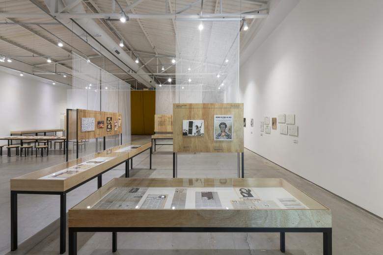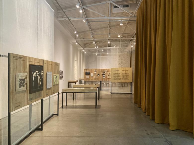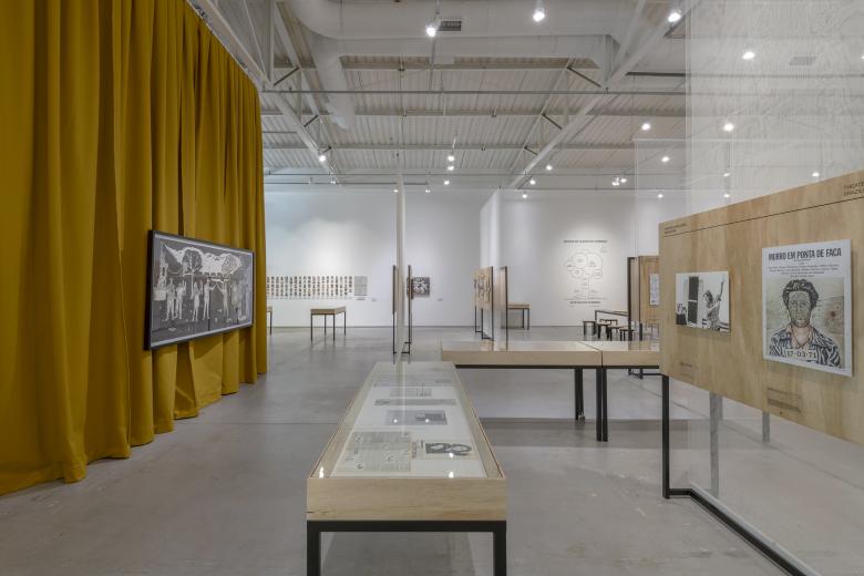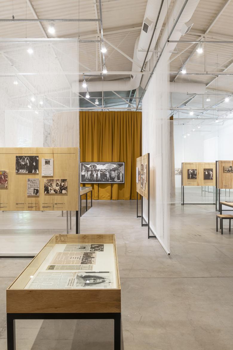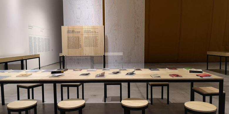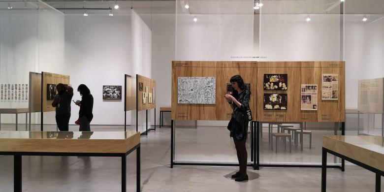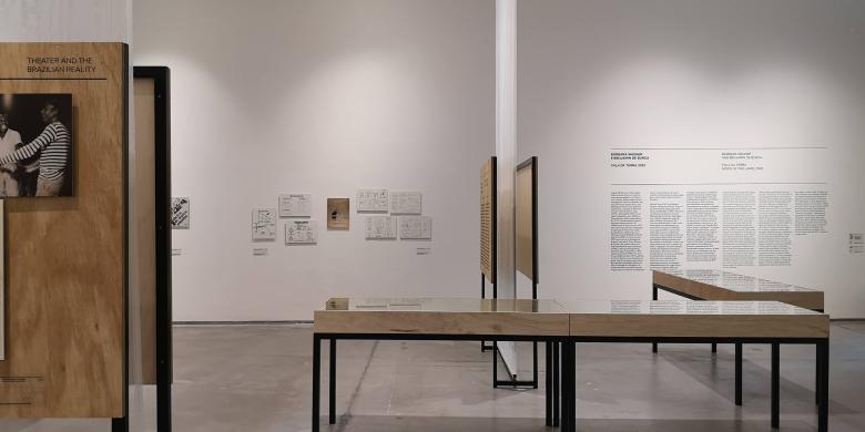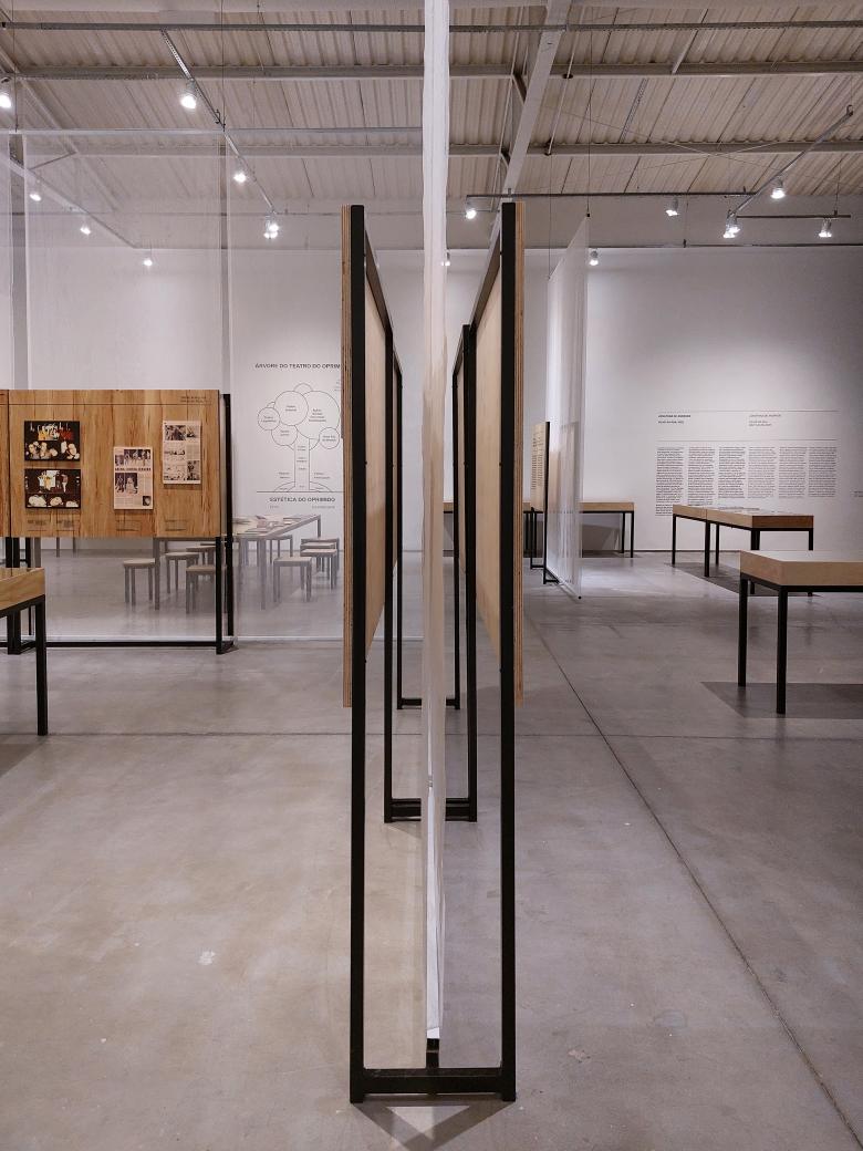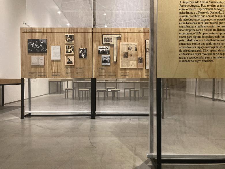 The documents about the playwrights are presented in vertical and horizontal supports. The main photos are on the self-supporting vertical panels, while the writings and newspaper articles are on the tables. The curatorship nuclei, “Augusto Boal, TEN and the Theater of the Oppressed” and “Theatre as an Instrument for the Worker's Self-Awareness”, conform two environments arranged in more or less fluid arrangements. Complementing the exhibition's documentation is a long table for consulting books on the two playwrights.